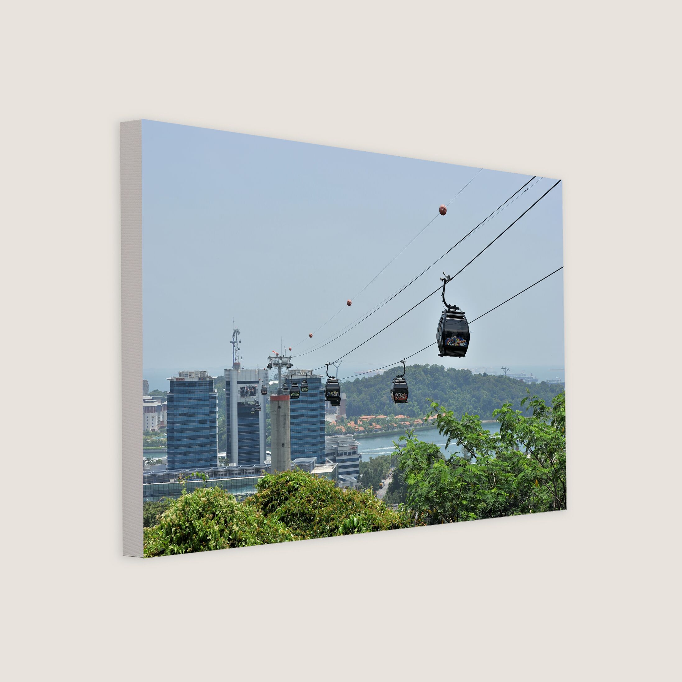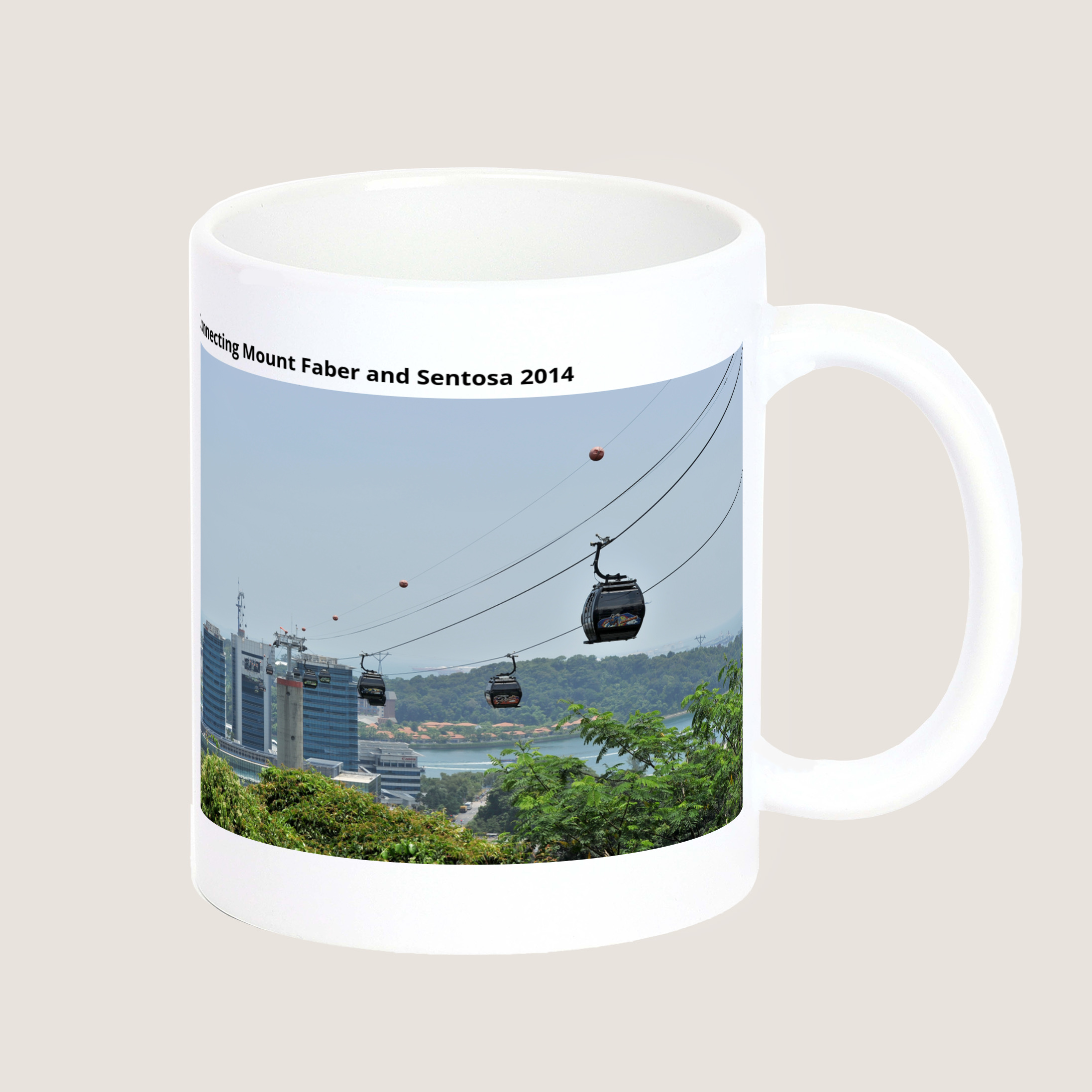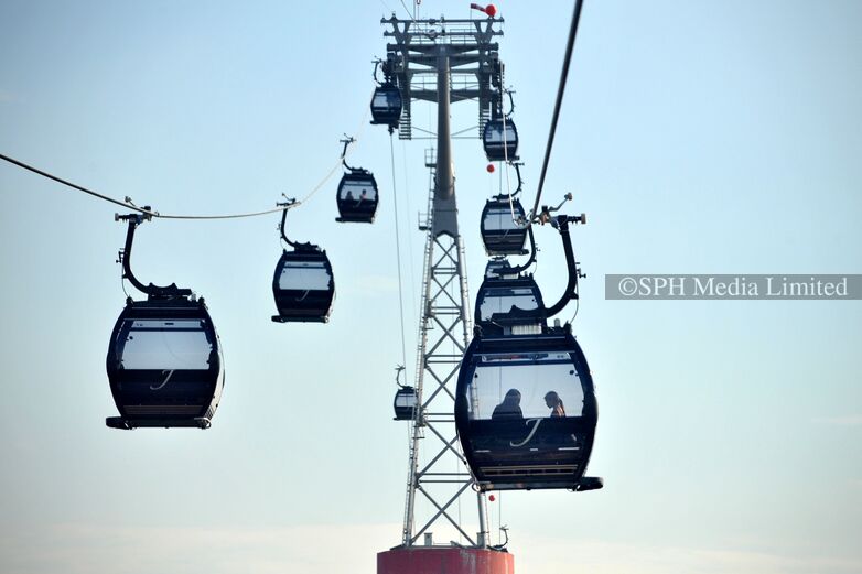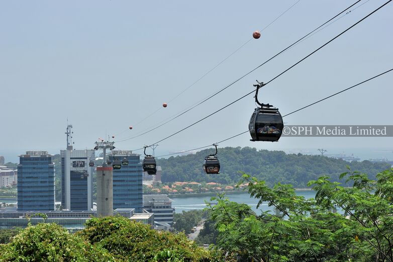 In 2014, the Singapore Cable Car system consisted of two independent lines, the Mount Faber Line, which provided services between Mount Faber and Sentosa stations, connecting Singapore's main island and Sentosa Island. The photos here show cable cars traveling between Mount Faber and Sentosa.