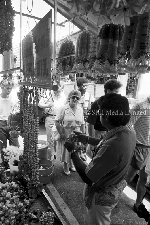Tourists walking along Little India in Serangoon Road were fascinated by the making of flower garlands. The making and use of flower garlands are primarily associated with the Hindu community in Singapore. Apart from rituals and worship, flower garlands are used in festivals like Pongal and Deepavali, as well as significant life events such as weddings.