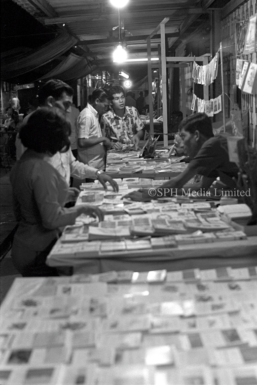 The bustling night scene of hawkers stalls and shoppers in Pagoda Street with just two more days to go before Chinese New Year on Sunday in 1959. Pagoda Street's name originated from the nearby Sri Mariamman Temple, located at the corner of South Bridge Road and Pagoda Street.