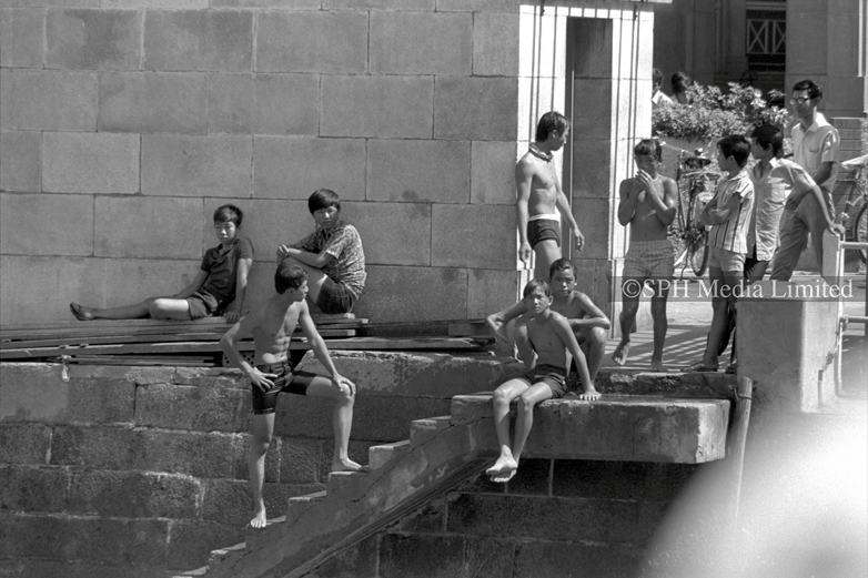 Teenagers are seen resting after a swim in the Singapore River near Cavenagh Bridge. Stretching across the Singapore River, the Cavenagh Bridge is the oldest bridge, completed in 1869. It was gazetted as a national monument in 2019.