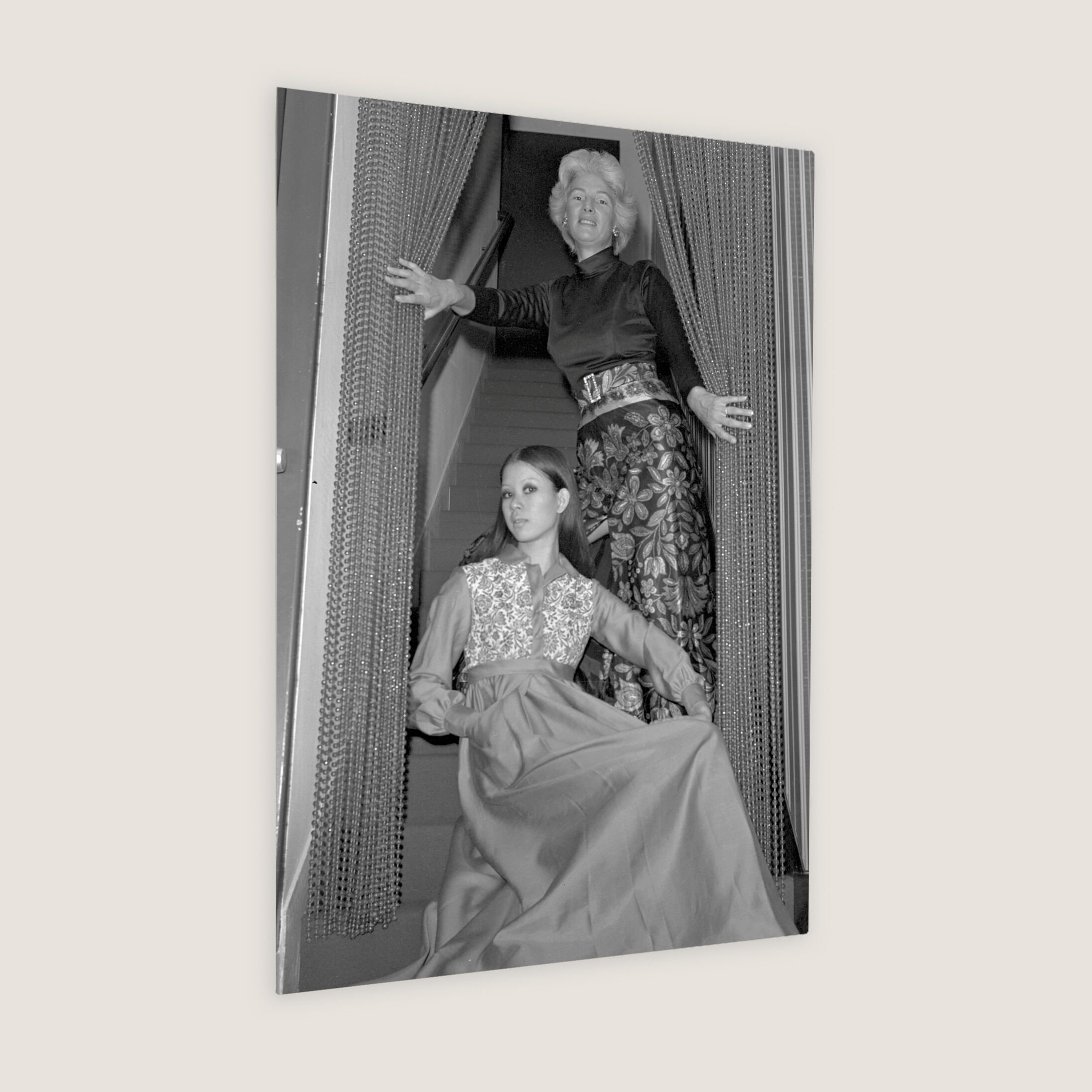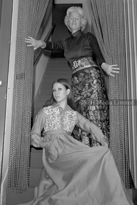 Featuring fashion for mature women, Mrs Sheila Snowden stands up in a long jersey dress that can be worn for a casual evening function. Meanwhile, Nancy models an ankle-length gown with an empire line.