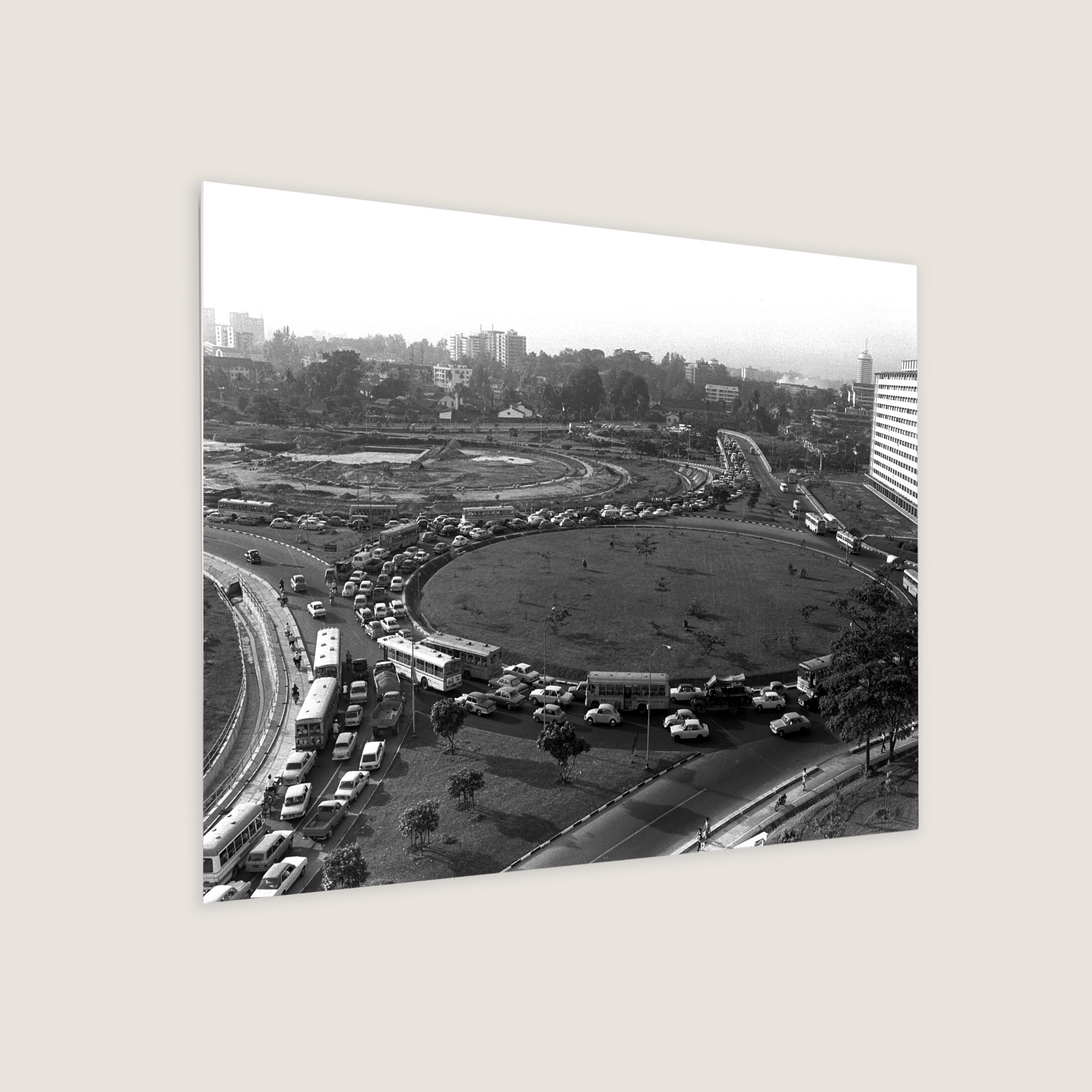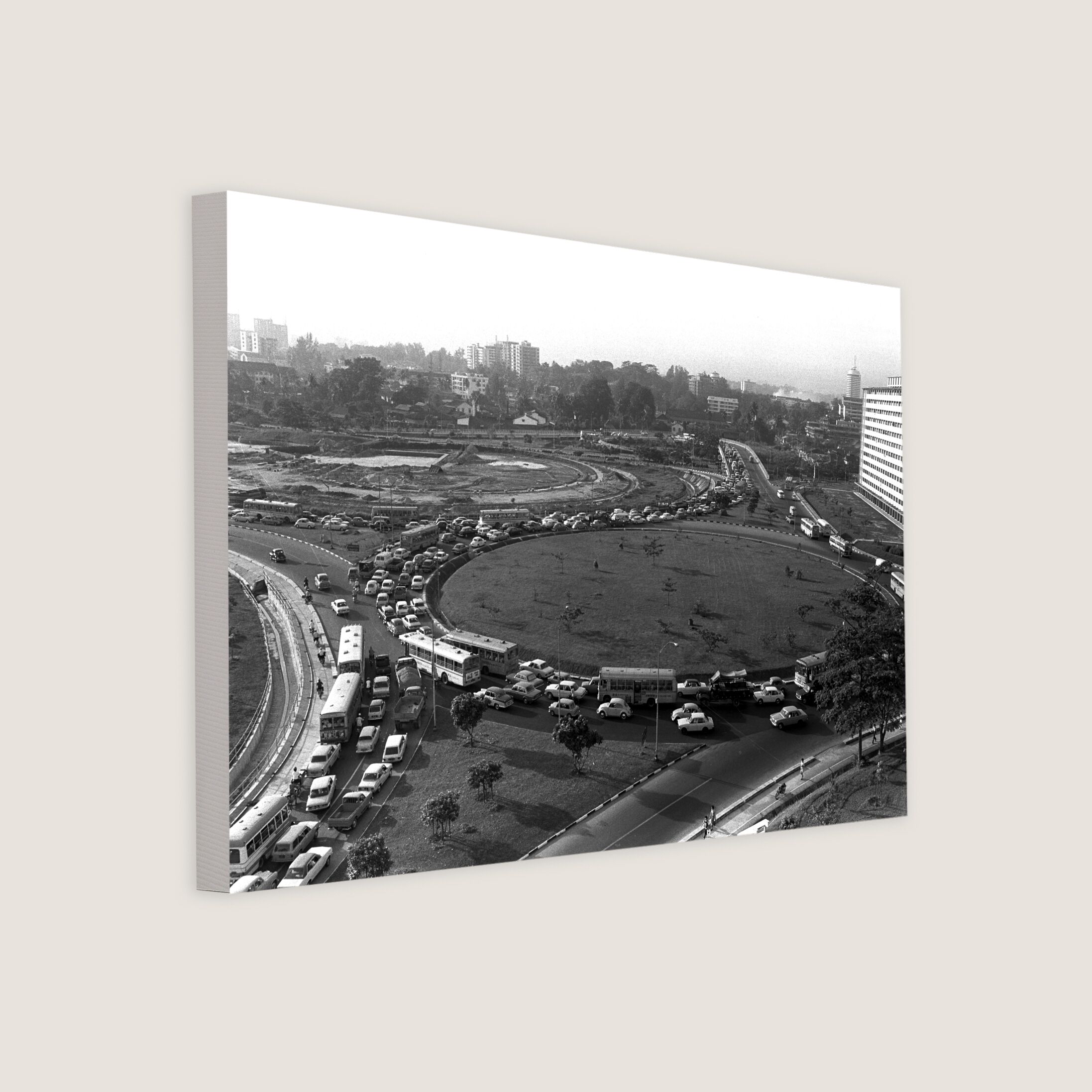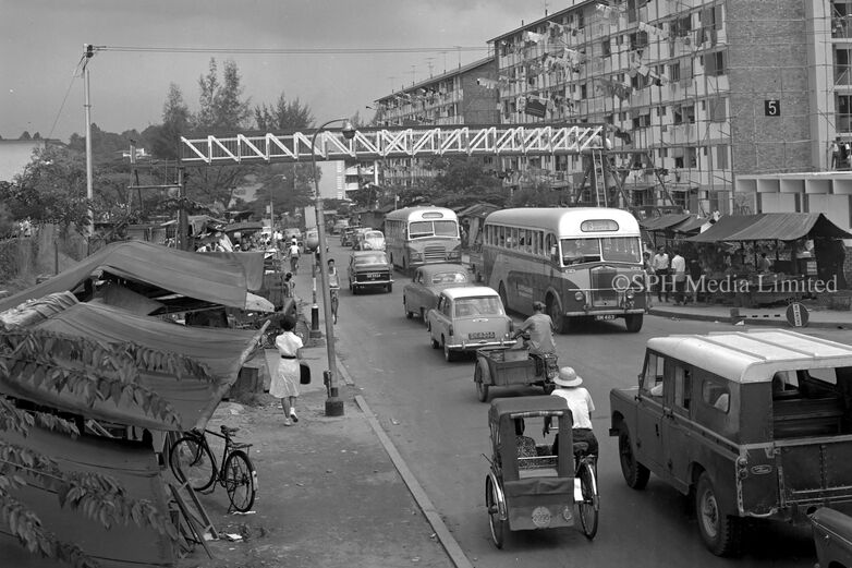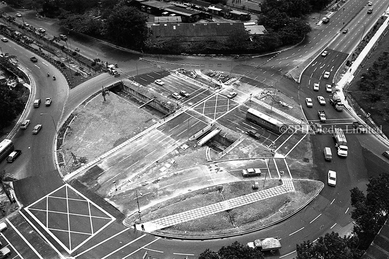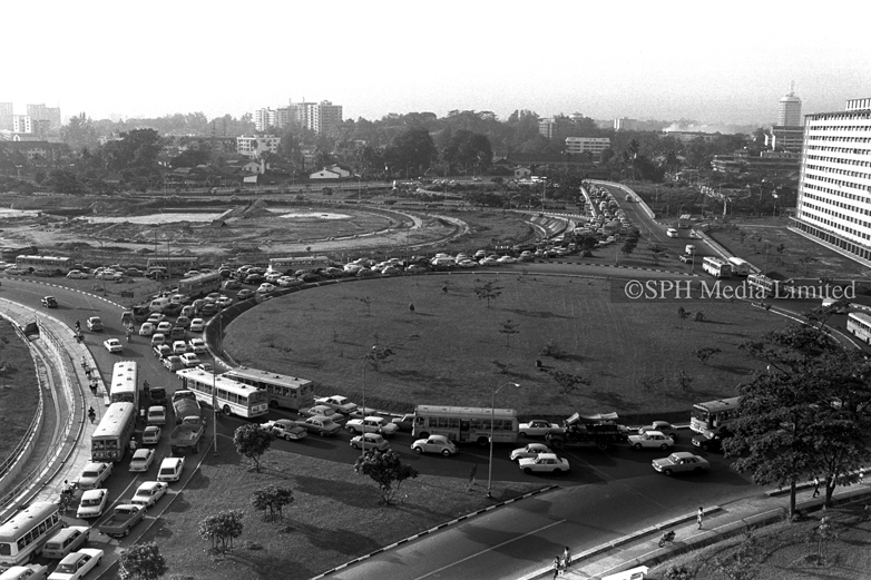Traffic circus at the early days of Toa Payoh town. In 1966, the satellite town welcomed its first residents. Roads were built to accommodate the growing population, but as part of Singapore's ongoing road upgrade efforts, roundabouts were gradually replaced.
