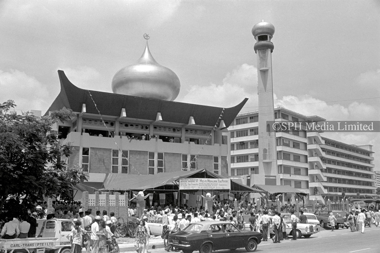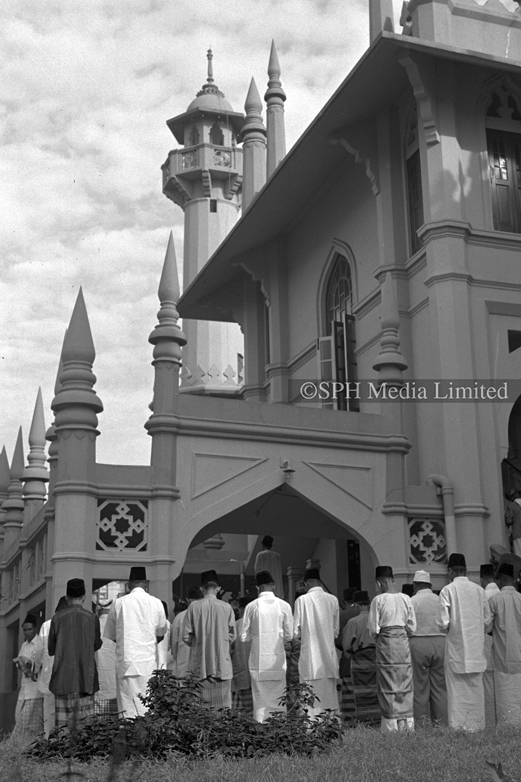 Muslims at the Sultan Mosque ready to make their prayers on Hari Raya Puasa. The Mosque was built in 1824 for Sultan Hussein Shah. Sir Stamford Raffles donated $3000 to the construction of the mosque. This contribution was a part of the treaty with the sultan in exchange for the right to establish a trading post on the island of Singapore.