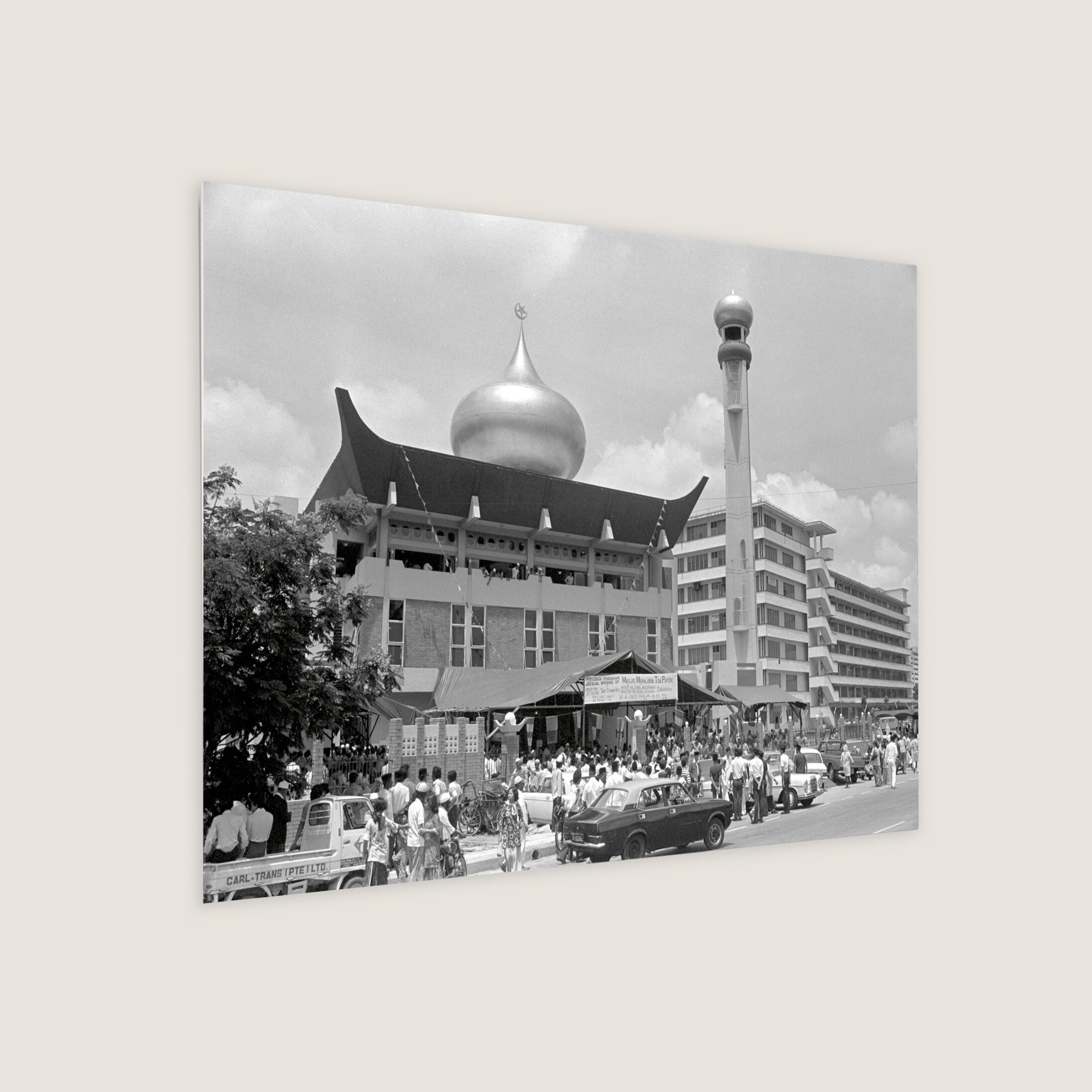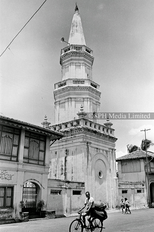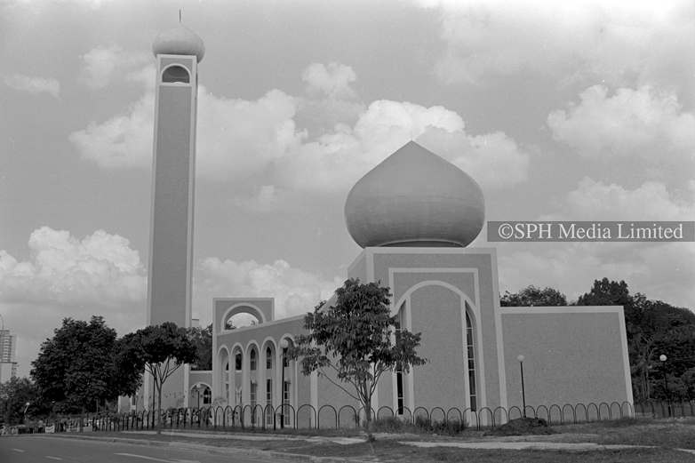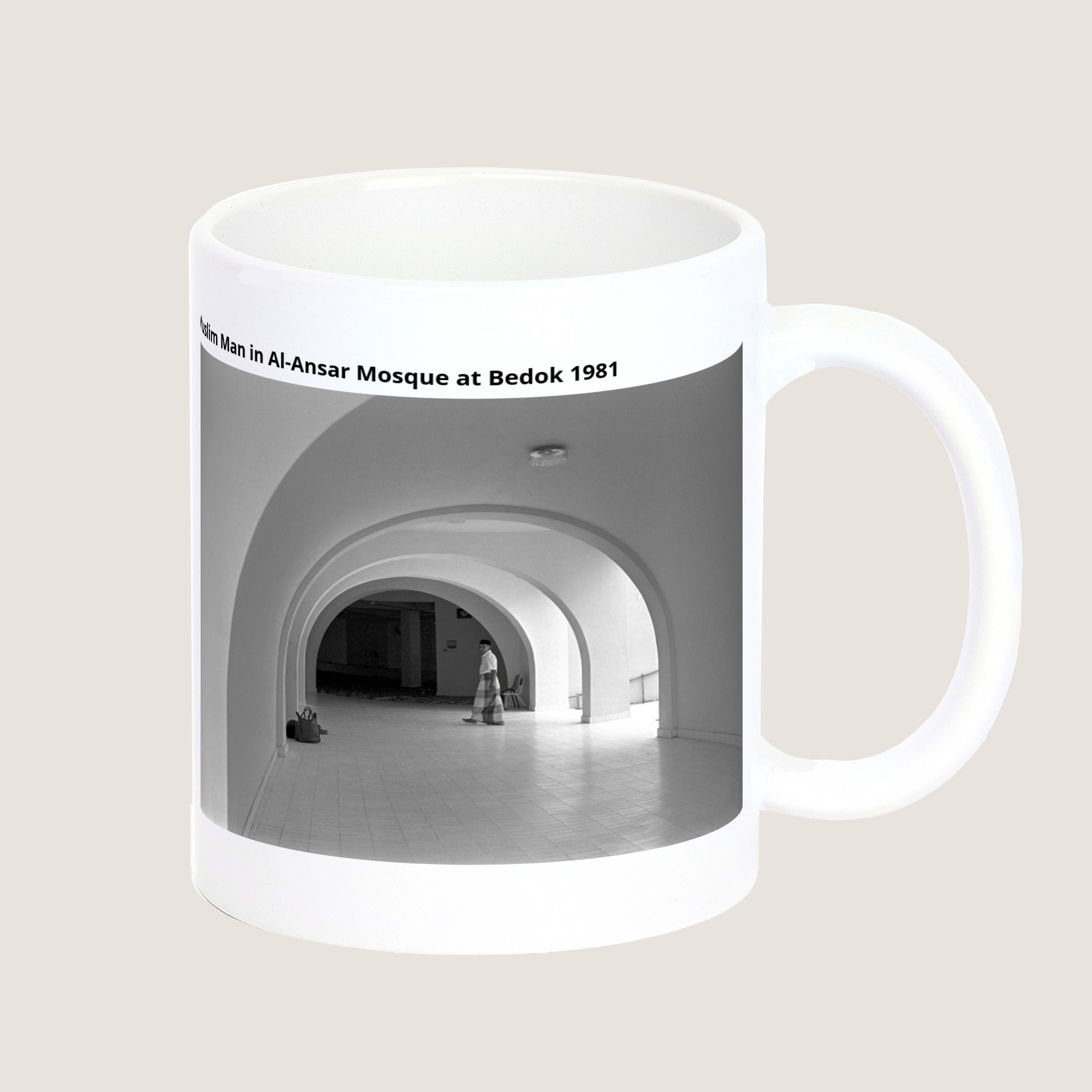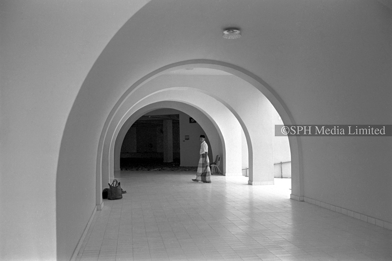 Featuring a Muslim man walking around the Al-Ansar Mosque, located at the junction of Chai Chee Street and Bedok North Avenue 1. Muslim community leaders wanted a mosque in the estate, and a proposal was put forth in 1974. By 1977, Al-Ansar Mosque started construction under phase one of the Mosque Building Fund (MBF) programme. Apart from the main prayer hall, it also has a conference room, Quran reading room, a library, a woman's gallery and living quarters.