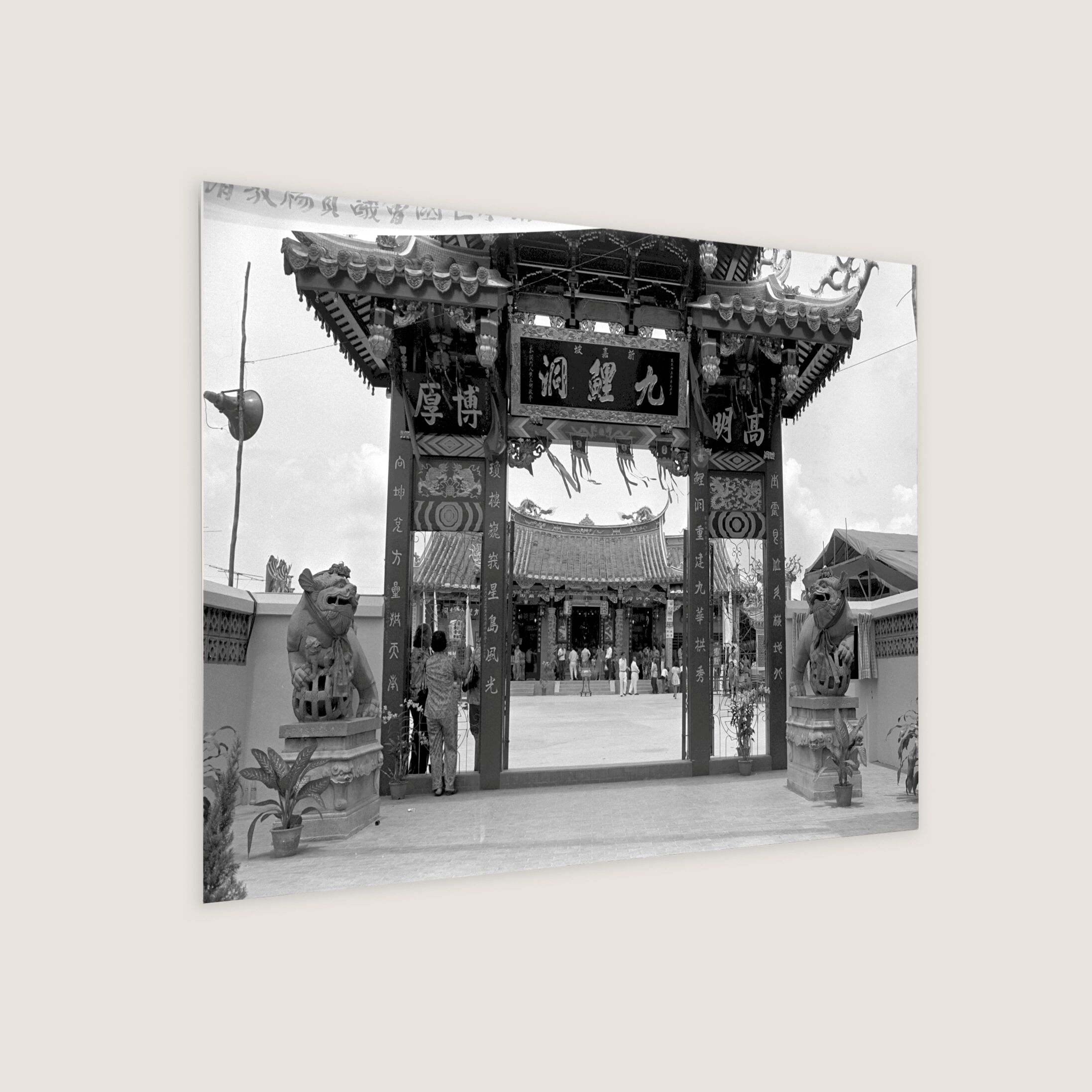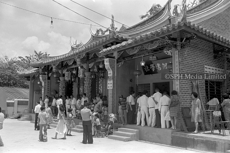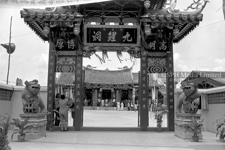 Devotees attending the official opening of Kiew Lee Tong Temple (九鲤洞, Abode of the Nine Carps) at Jalan Tambur, off Upper Thomson Road. It is a Hokkien Taoist temple of the Henghwa (兴化)community. The temple was established in 1934 in Arab Street, commemorating the nine He (何) brothers who, according to legend, ascended to heaven by riding on nine carps.