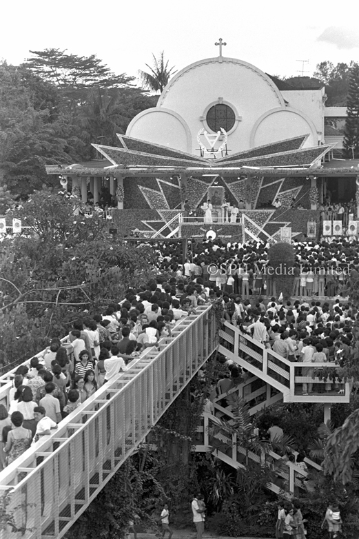 The facade of Novena Church was decorated with flowers for the celebration in honour of Our Mother of Perpetual Help, 6 September 1981.