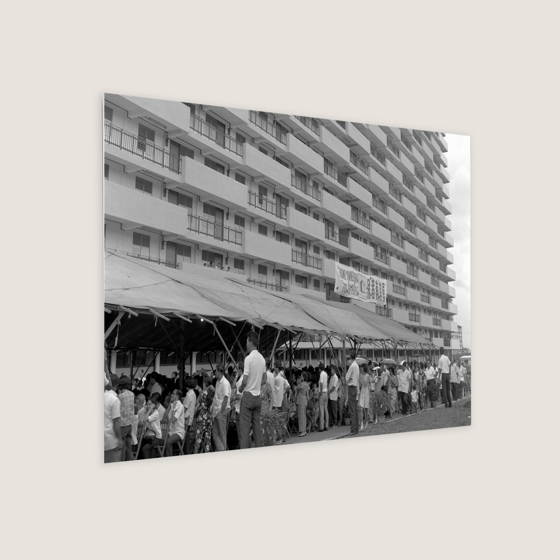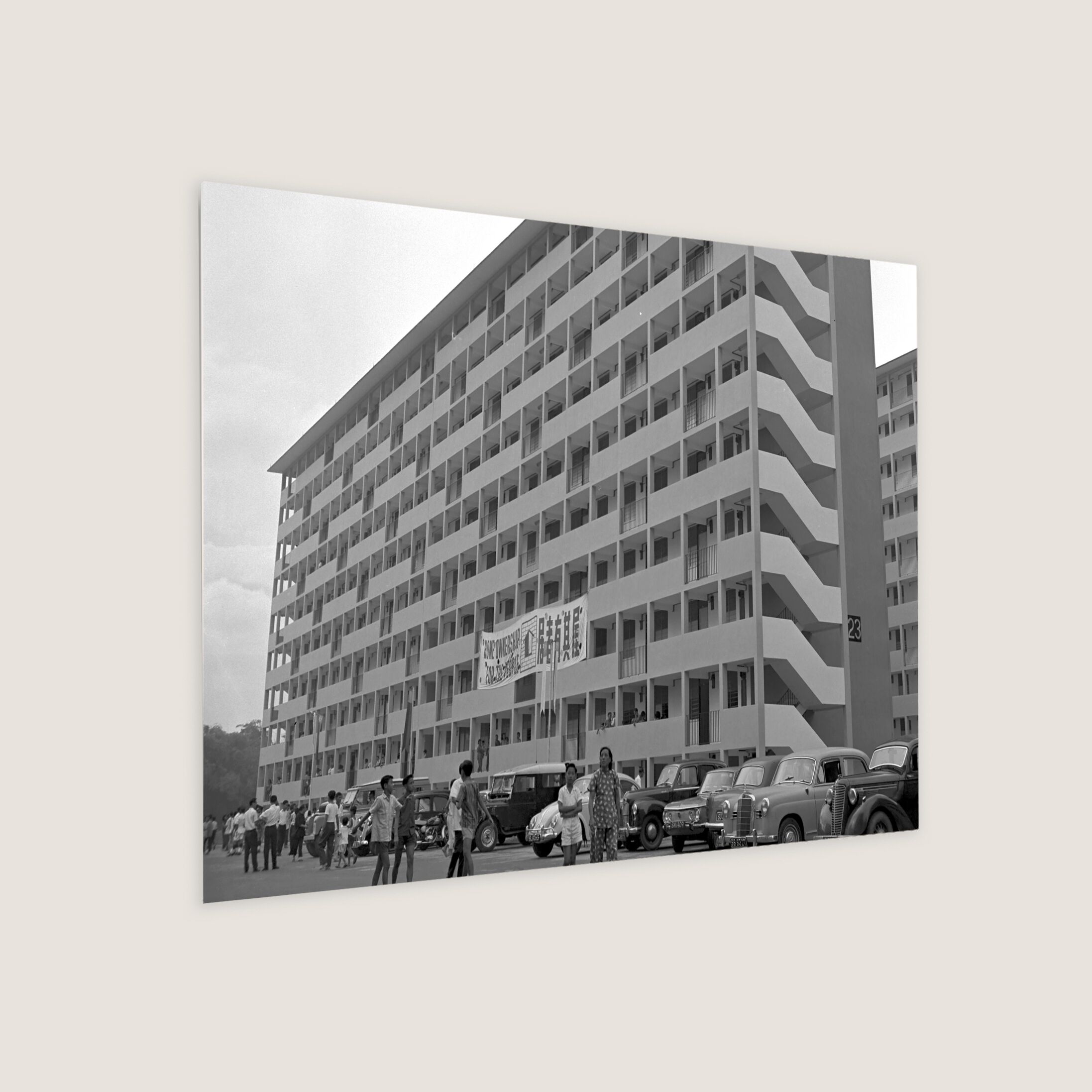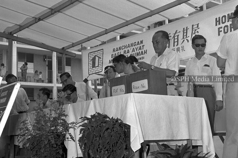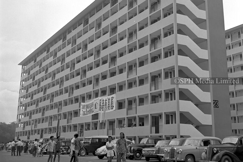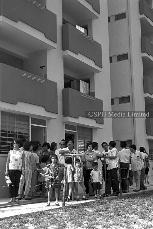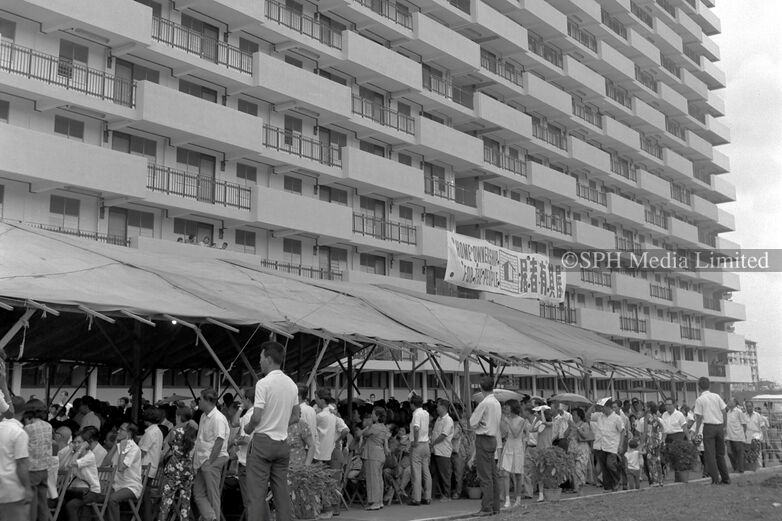 Crowds at the 19th-storey Y flat ready for balloting at Toa Payoh estate in the 1960s. It was a highlight of Singapore's architecture, with an innovative take. It was known as the 'VIP block' due to the number of foreign and local dignitaries visiting this location. Famous guests include former Australian Prime Minister John Gorton, Queen Elizabeth II, Princess Anne and Prince Phillip of the United Kingdom, and former Sri Lankan Prime Minister Bandaranaike Sirimavo.
