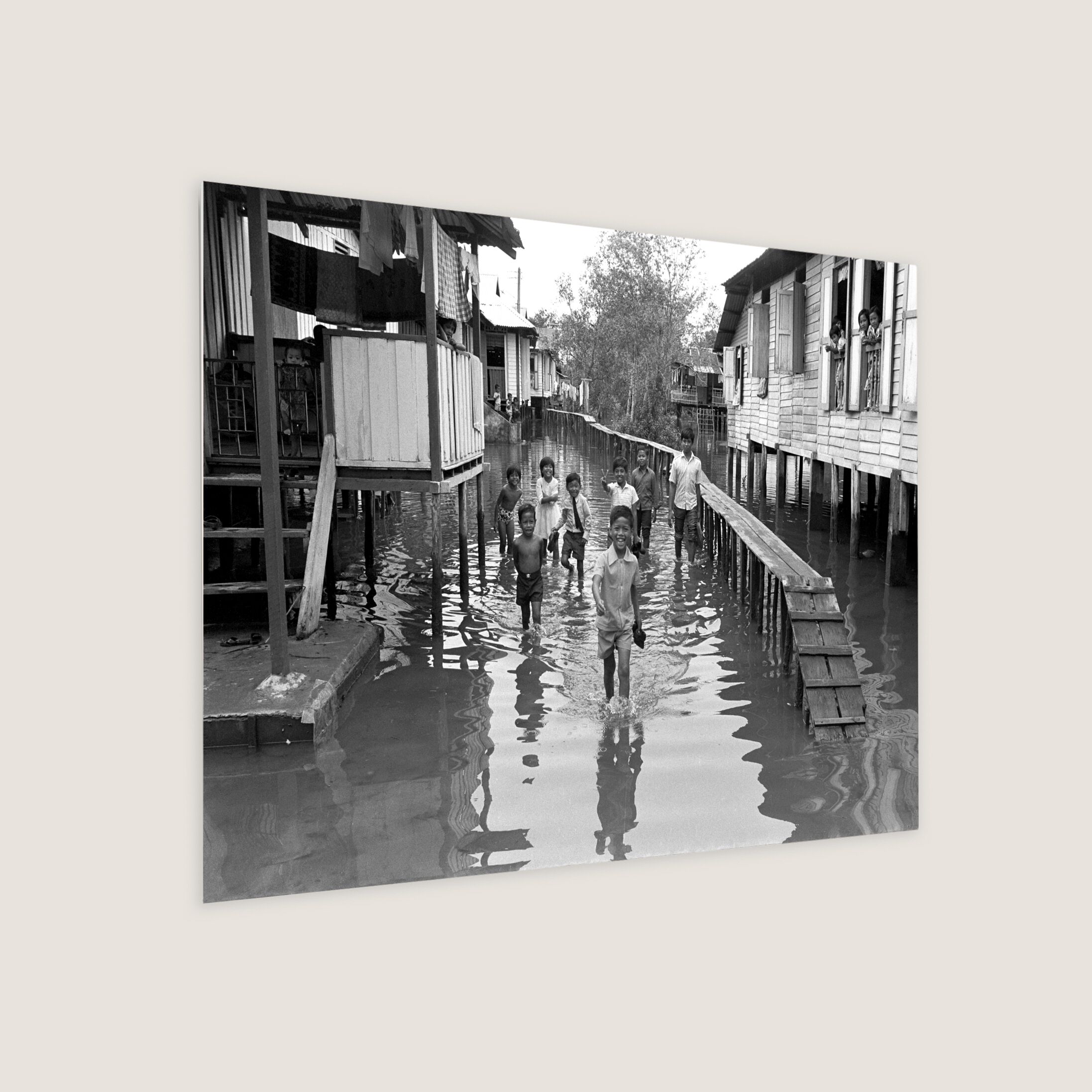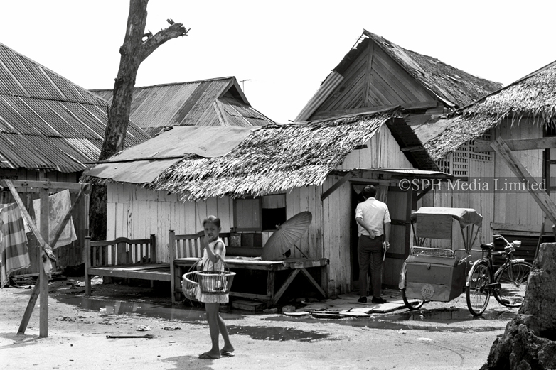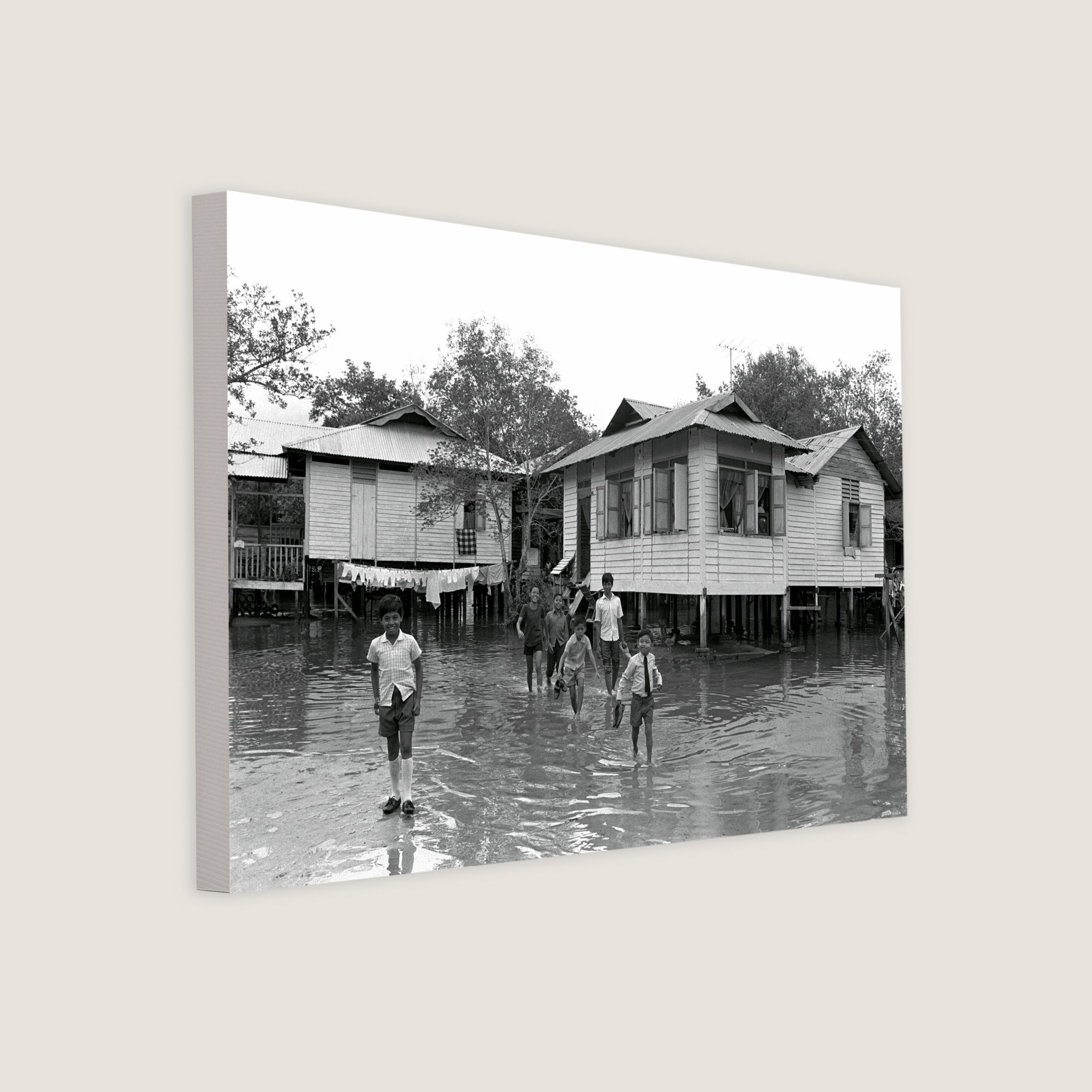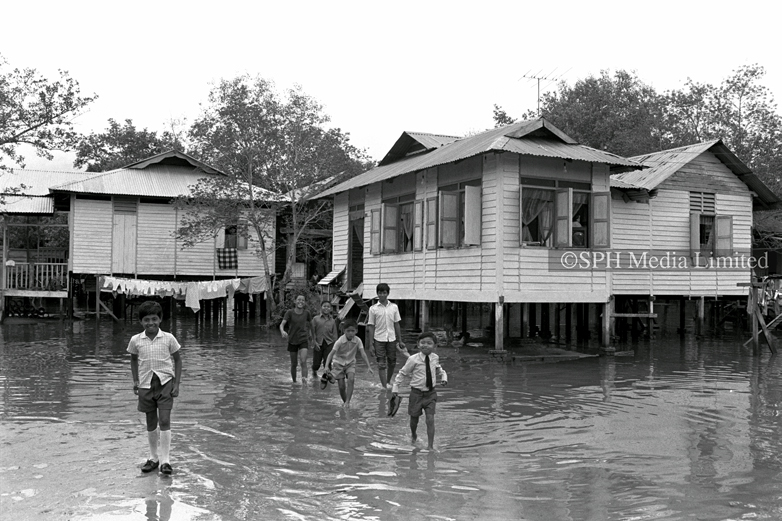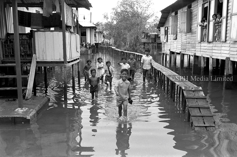 Heavy rains failed to dampen the Hari Raya spirit of the children at Kampong Sungei Mandai Kechil in Woodlands. Dressed in their holiday best, they make their way through the muddy waters. The Kampong was eventually taken down to make way for the Customs Department extension to the Woodlands Checkpoint.