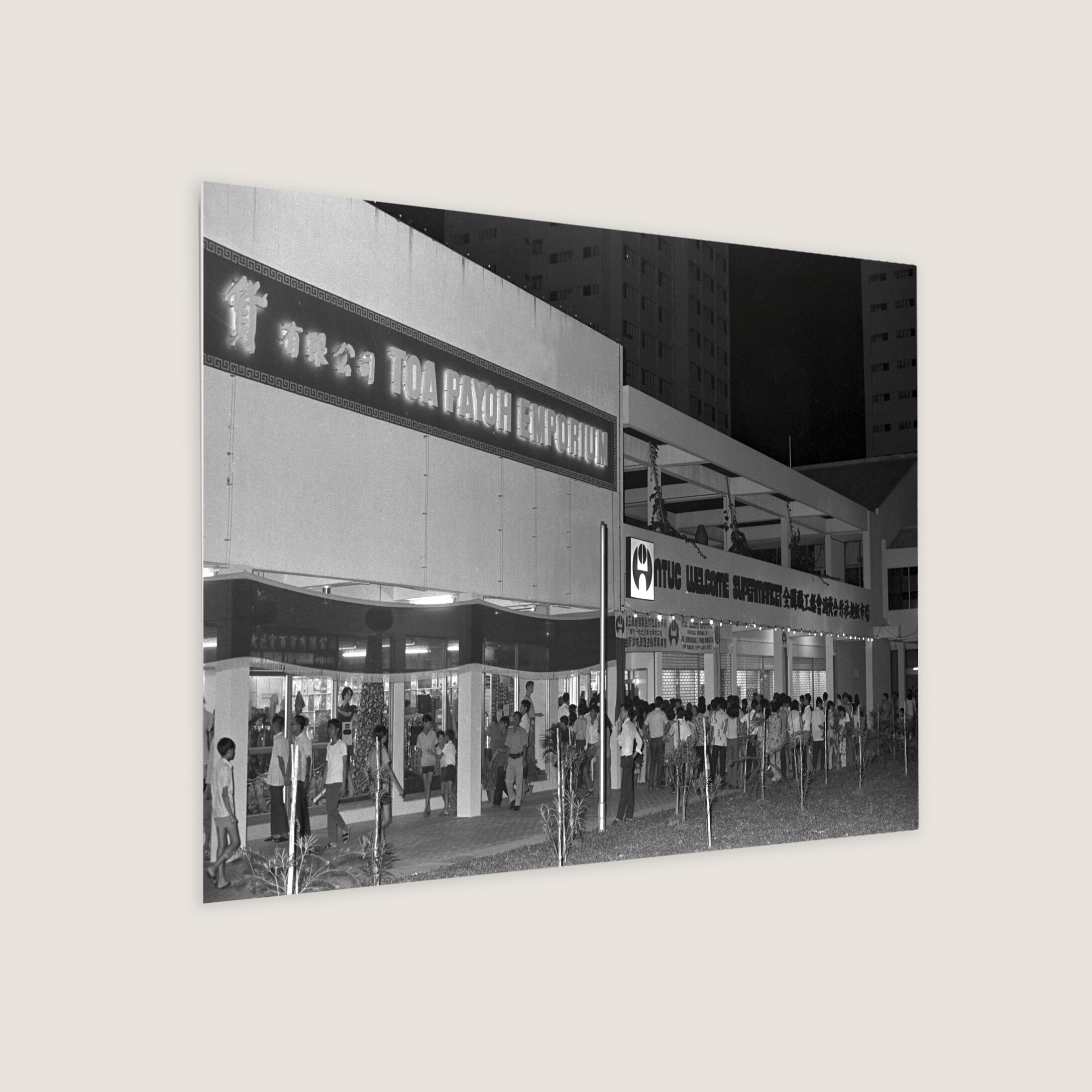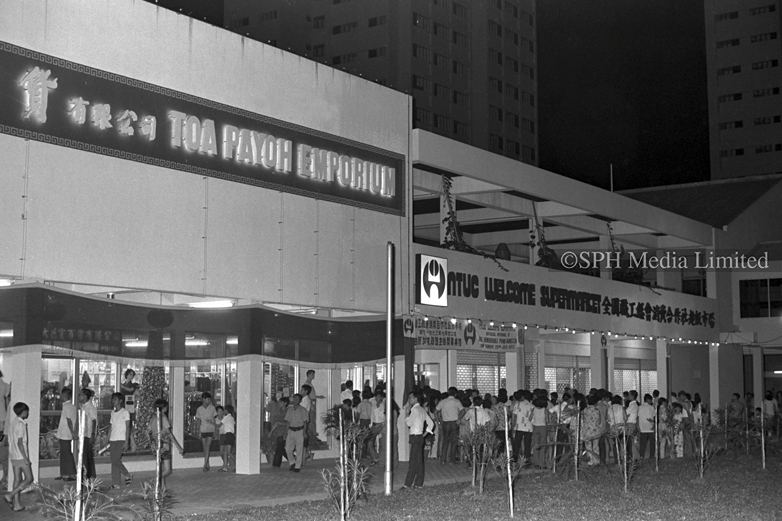 Crowds waiting at the entrance of the NTUC Welcome Supermarket at Lorong 4, Toa Payoh before the official opening, 22 July 1973. It was the first supermarket run by NTUC. The supermarket was next to the Toa Payoh Emporium. The Emporium is a chain of department stores in the 70s and 80s.