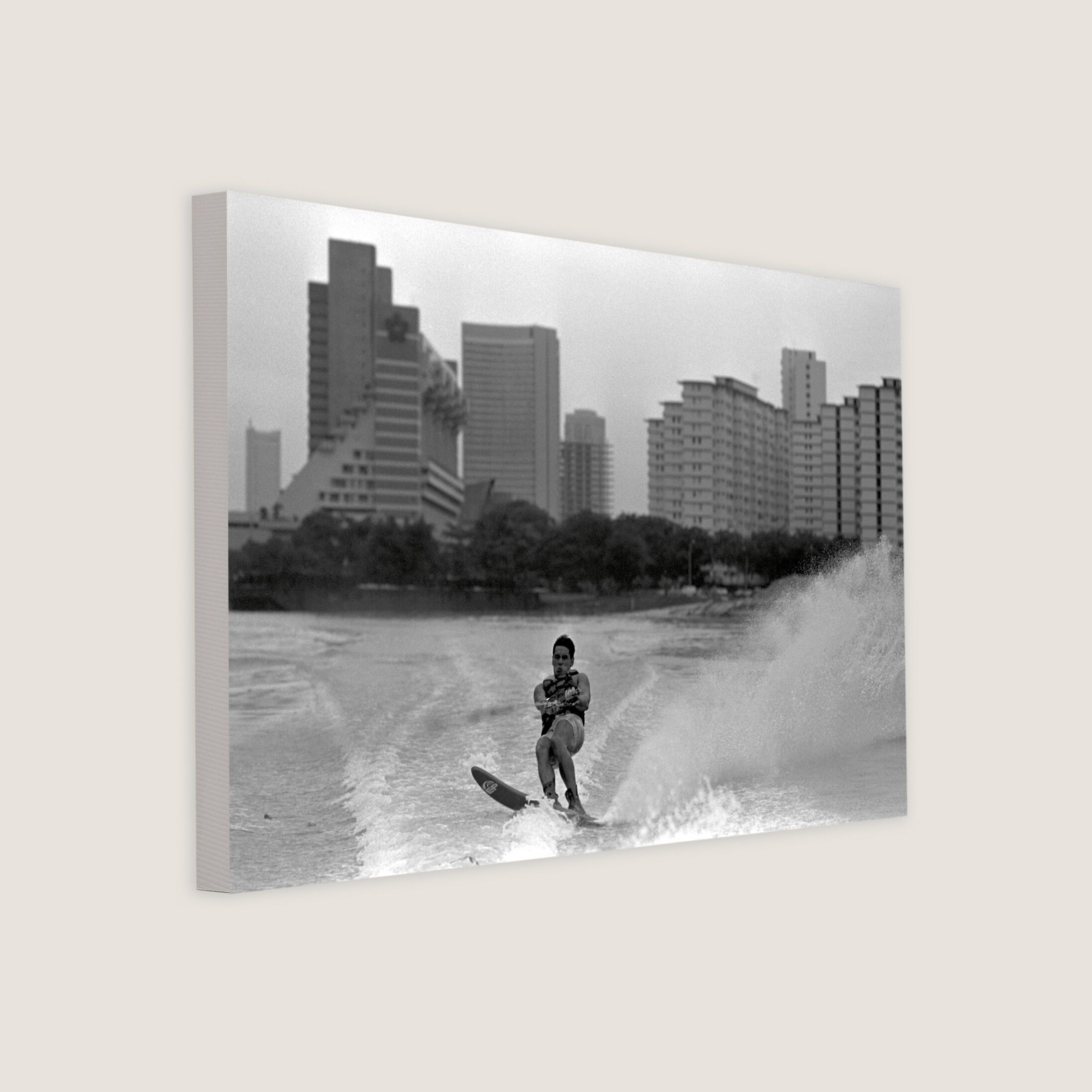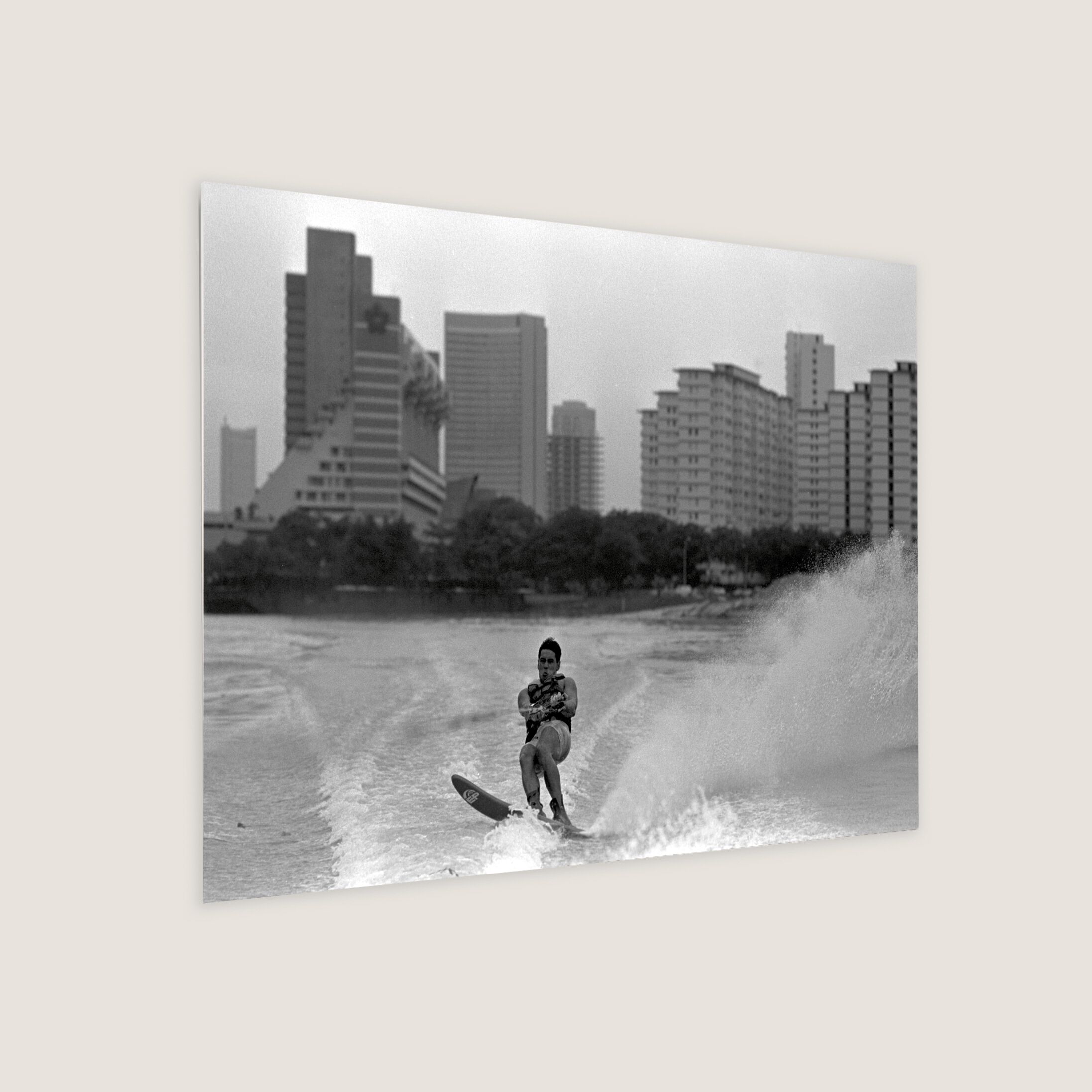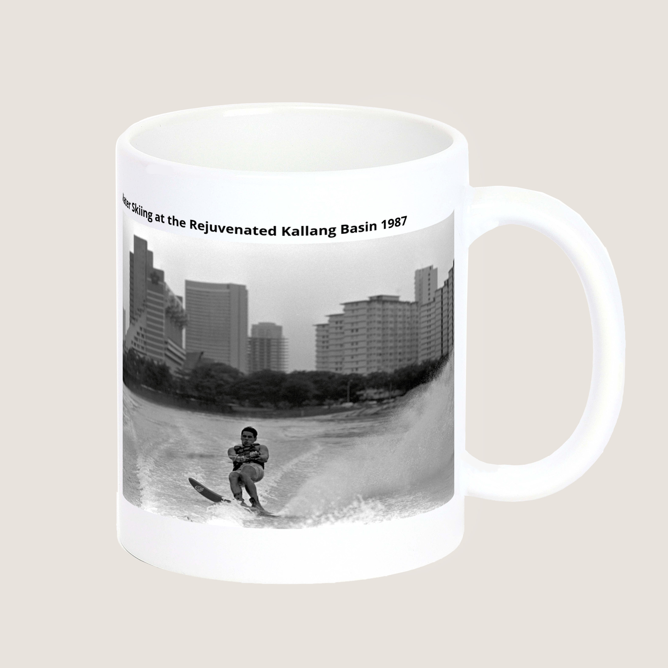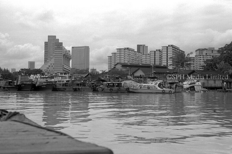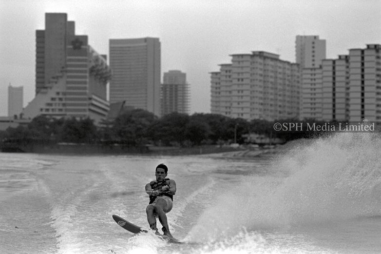 In the early 1990s, following a 16-year effort to clean up Singapore's polluted waterways, Mr Paul Fong was one of the first people who water-skied on the rejuvenated Kallang River. Today, the Kallang Basin hosts water sports like kayaking and dragon boating, overseen by the Singapore Sports Hub. Landmarks such as the Golden Mile Complex and nearby HDB flats stand in the background.