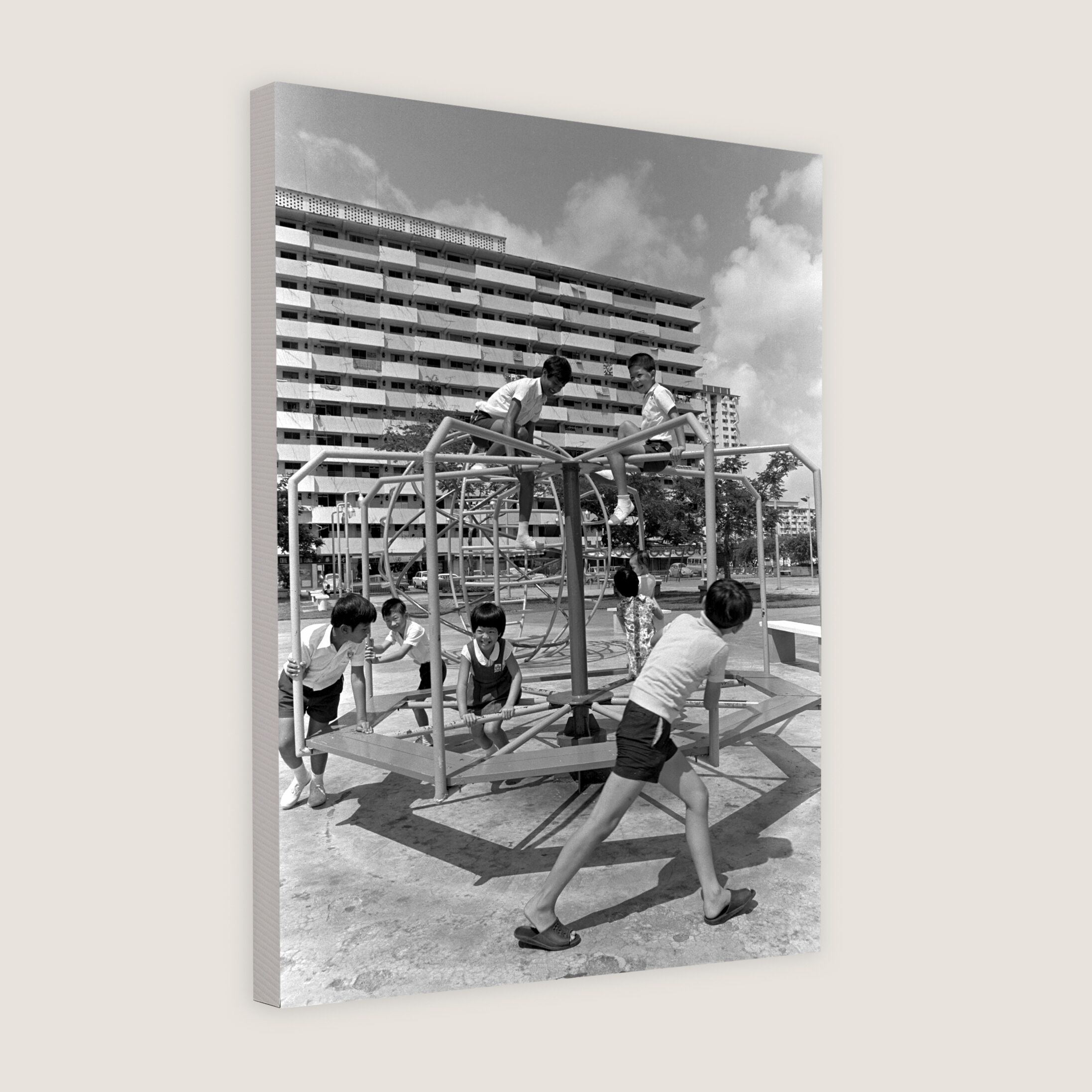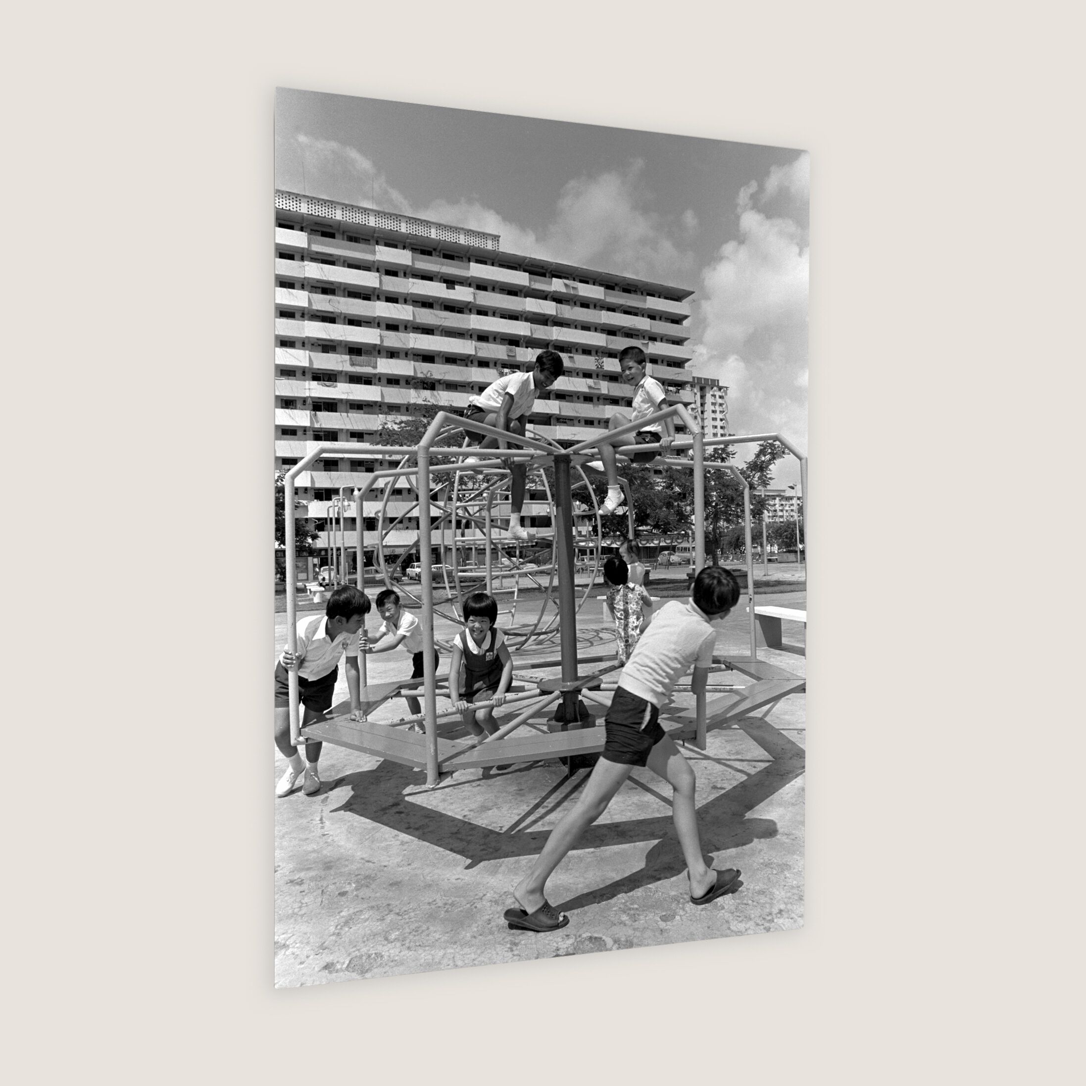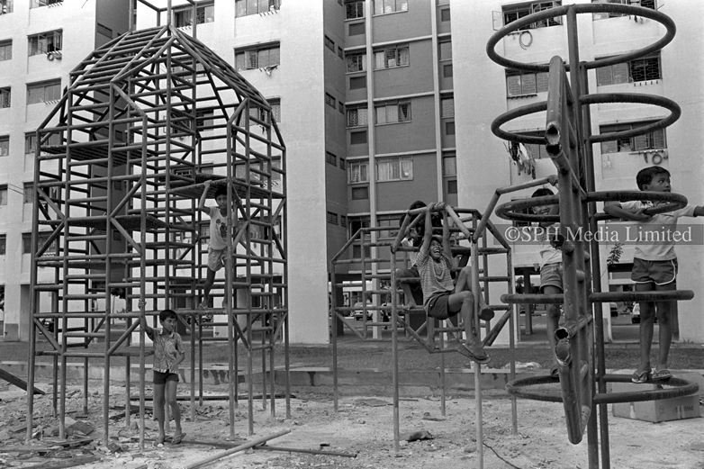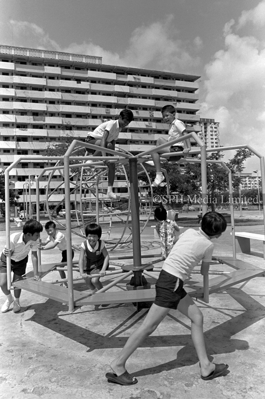 Children at a playground in Toa Payoh. When the Housing Development Board (HDB) took over from the SIT in 1960, it decided to design playgrounds that drew on local heritage and culture to help create stronger communal bonds. The board’s playgrounds typically comprised simple, geometric or animal-shaped concrete structures in sand pits.
