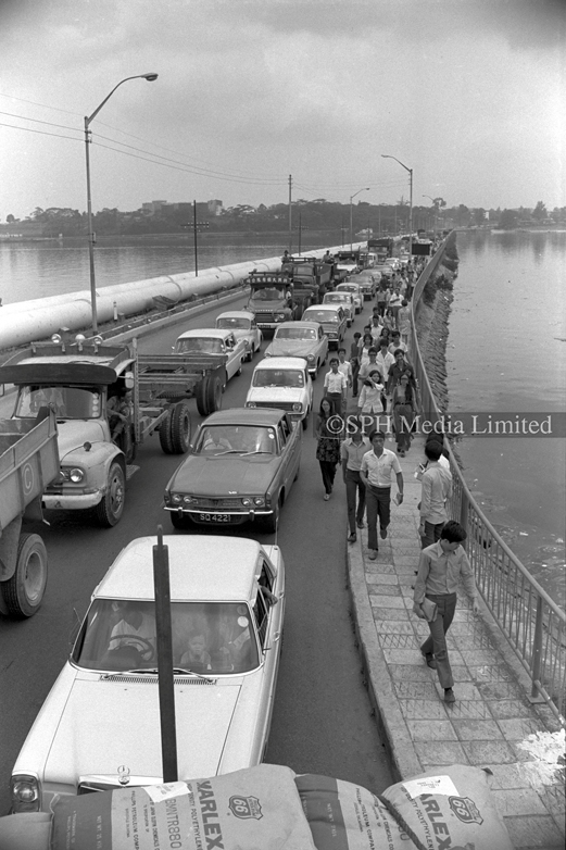 People walked from Woodlands checkpoint to Johore Bahru due to a massive traffic jam attributed to the Easter Holiday in 1972. A common scene of being caught in the customs checkpoint jam still prevails today.
