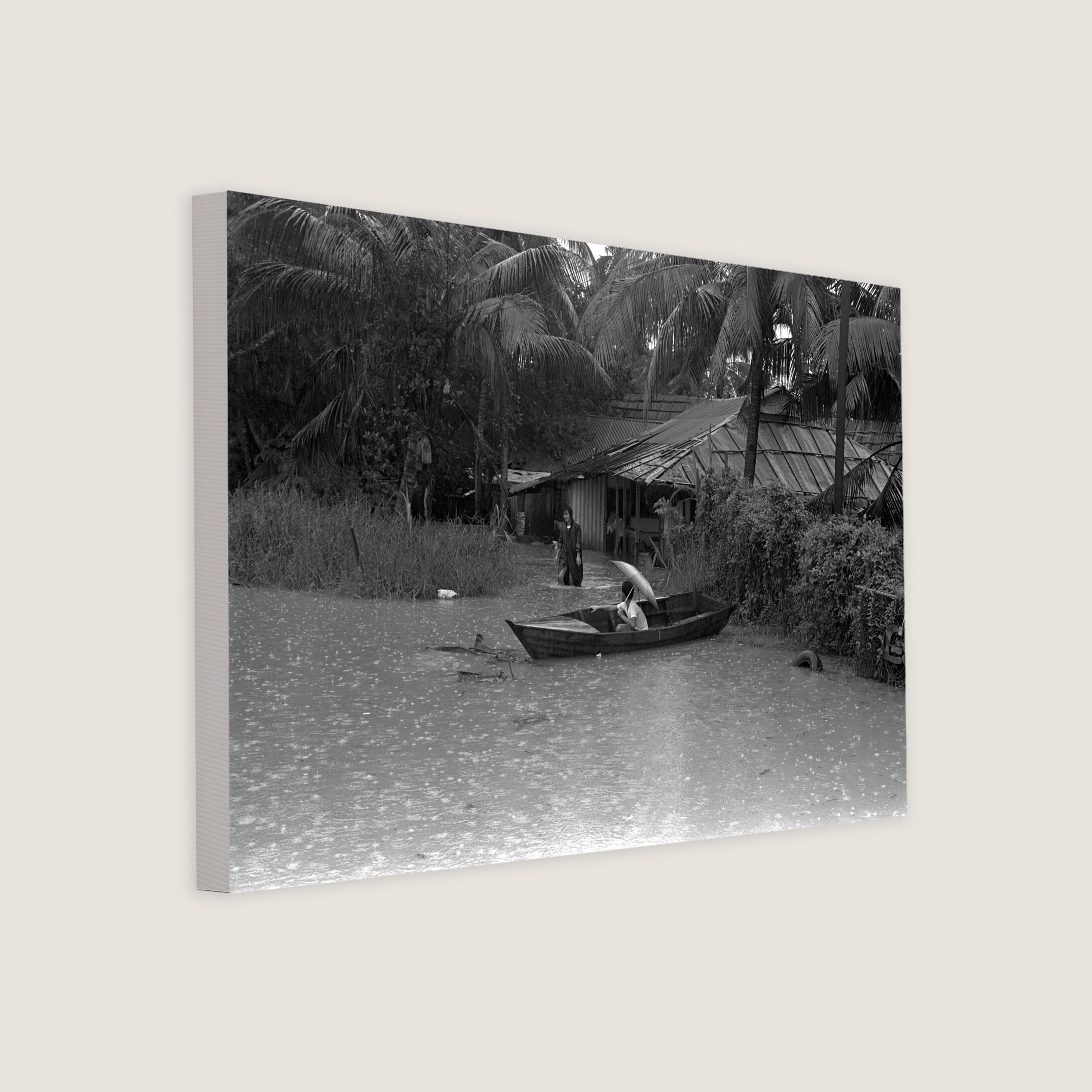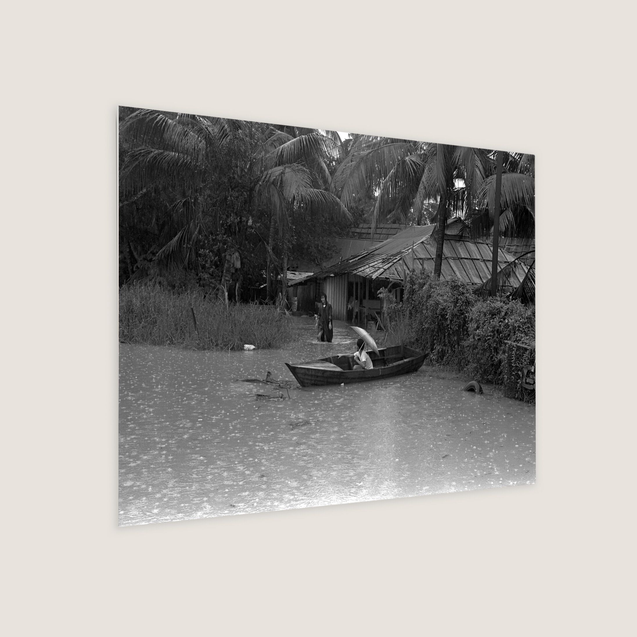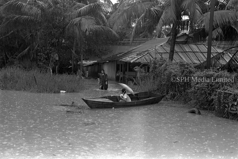 In the 1970s and 1980s, Potong Pasir, near the Kallang River, faced regular flooding. In 1980, a heavy downpour caused the river to overflow, flooding Meyappa Chettier Road. The photo depicts a family evacuating near their Meyappa Chettiar Road home by sampan. The area is now redeveloped with private condos, and the Kallang River has been embanked, preventing the past flooding from recurring.