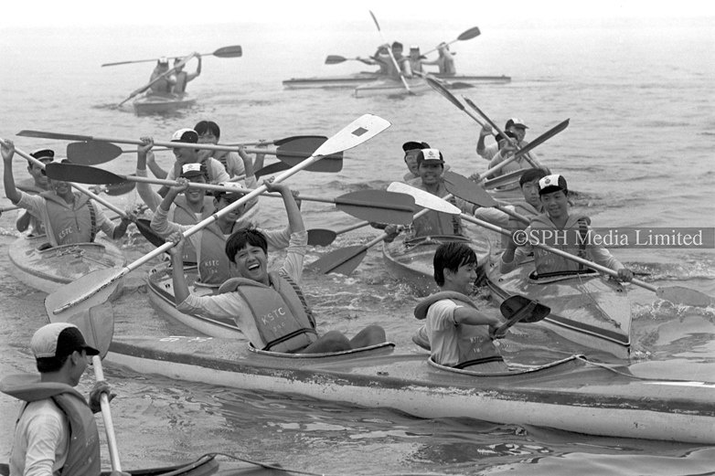 108 young and happy sea cadets started from Woodlands and arrived at Sembawang waters after an arduous two-day round-the-island canoe trip. The expedition, the 8th of its kind, was held annually to test their skills and stamina.
