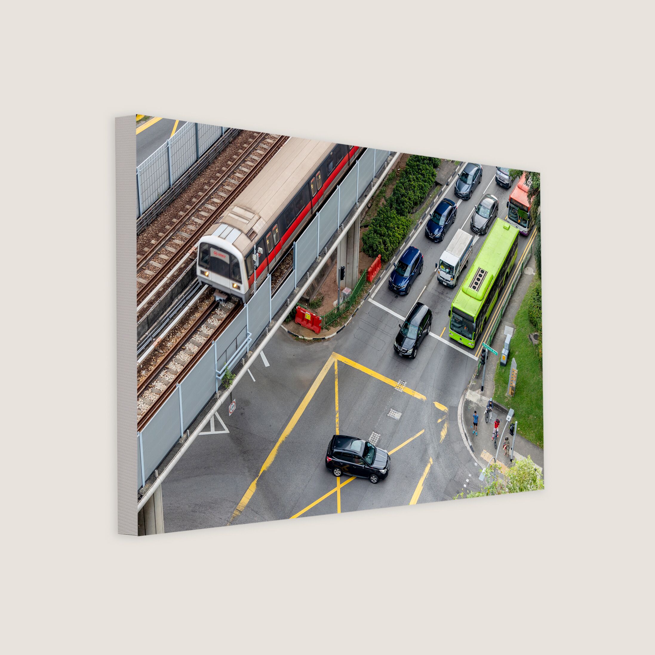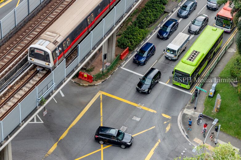 Aerial view from Block 8 on Holland Avenue, where the junction bustles with various modes of transport, including buses, the MRT, and private cars. This is a typical scene on the roads of present-day Singapore.