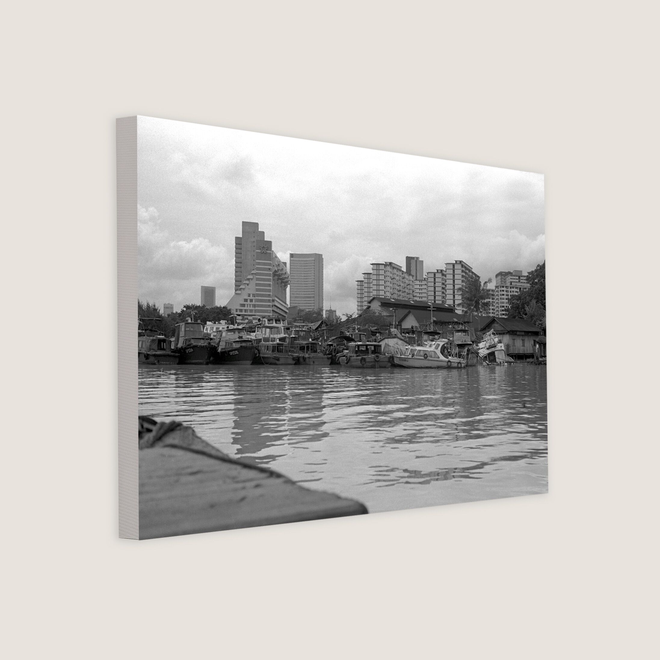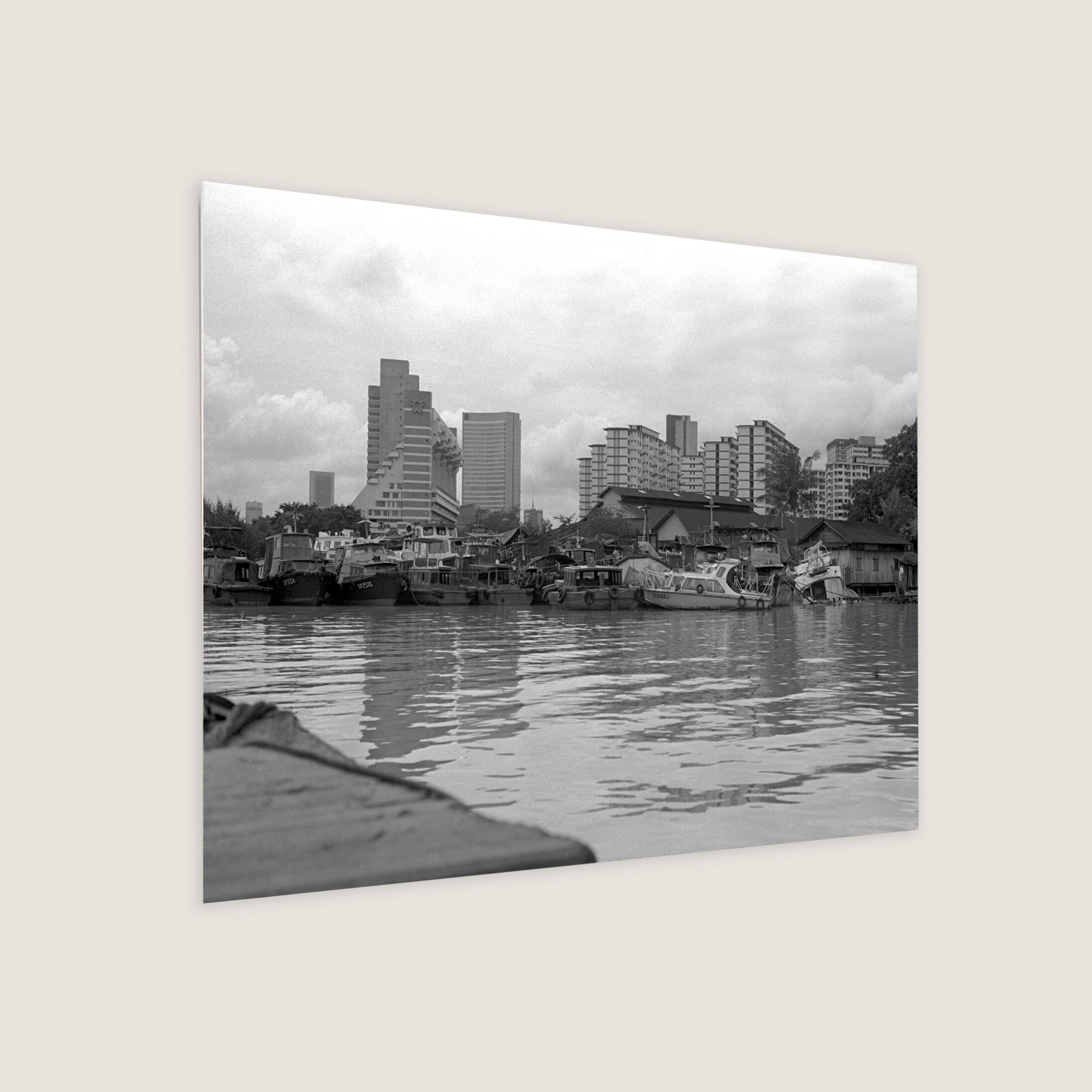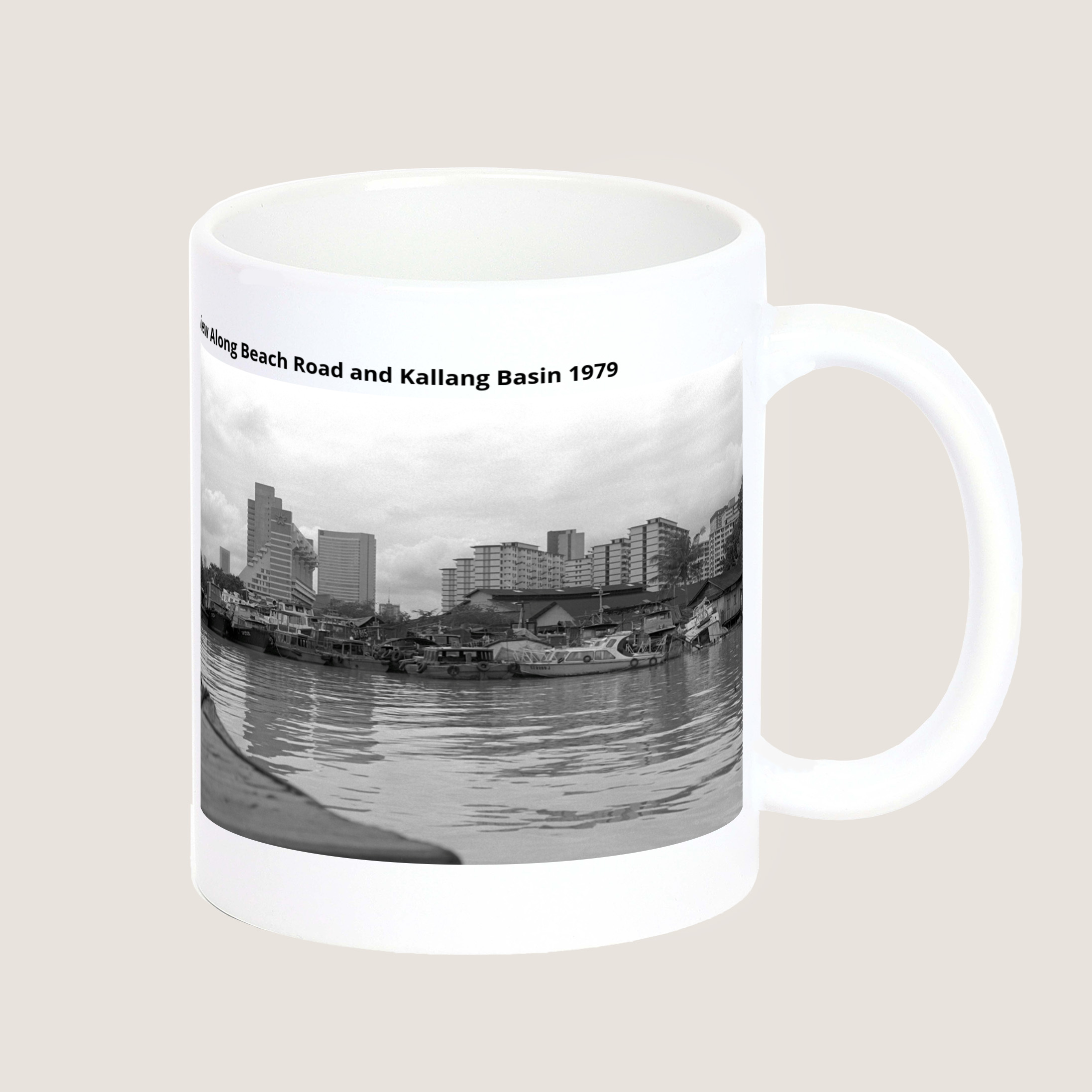 A view of Kallang Basin in the late 1970s shows sawmills, factories, and workshops along its banks. To the left stood Merlin Plaza (now Hotel Royal Plaza) and Golden Mile Complex, while HDB flats lined Beach Road and Crawford Lane. After the river clean-up, waterfront shophouses and boats were relocated, transforming the Kallang Basin landscape.