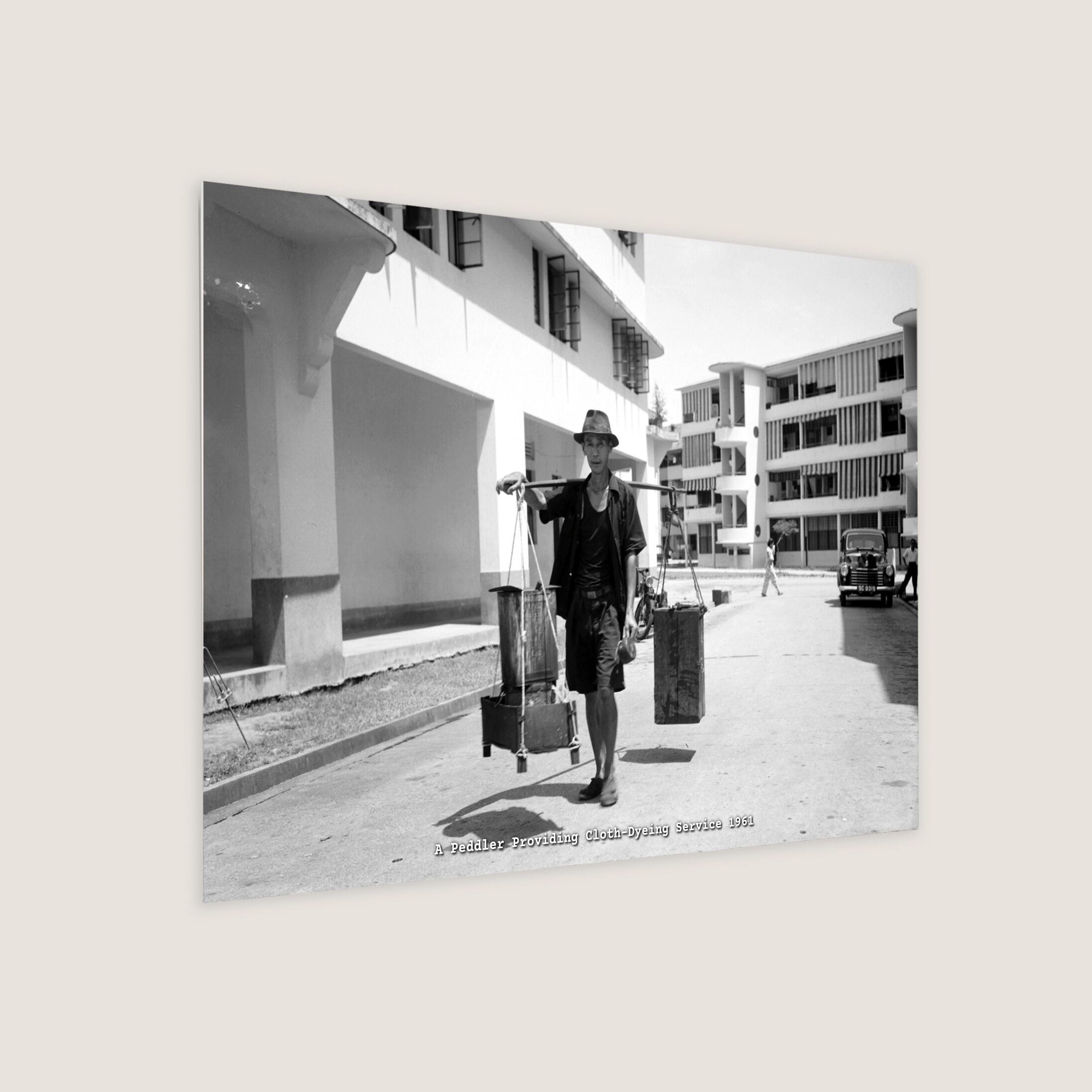 A peddler providing cloth-dyeing services at the Singapore Improvement Trust (S.I.T.) flats in Tiong Bahru. Cloth-dyeing peddlers like him have long faded into the past, but it was once an honest means of livelihood.