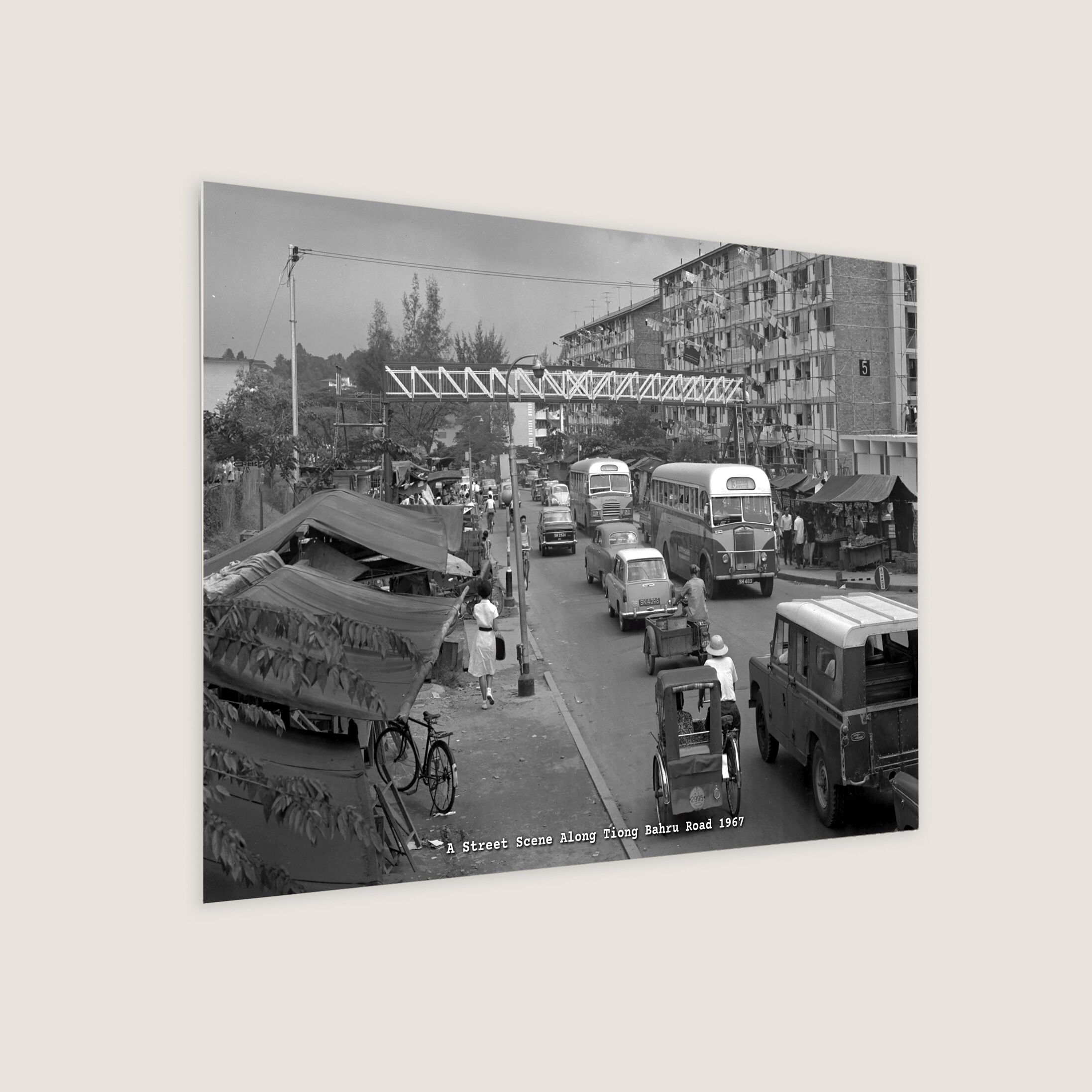 The photo shows the construction of an overhead bridge at Tiong Bahru Road, near Jalan Membina, capturing the mix of old and new housing in the area during the 1960s and 1970s.