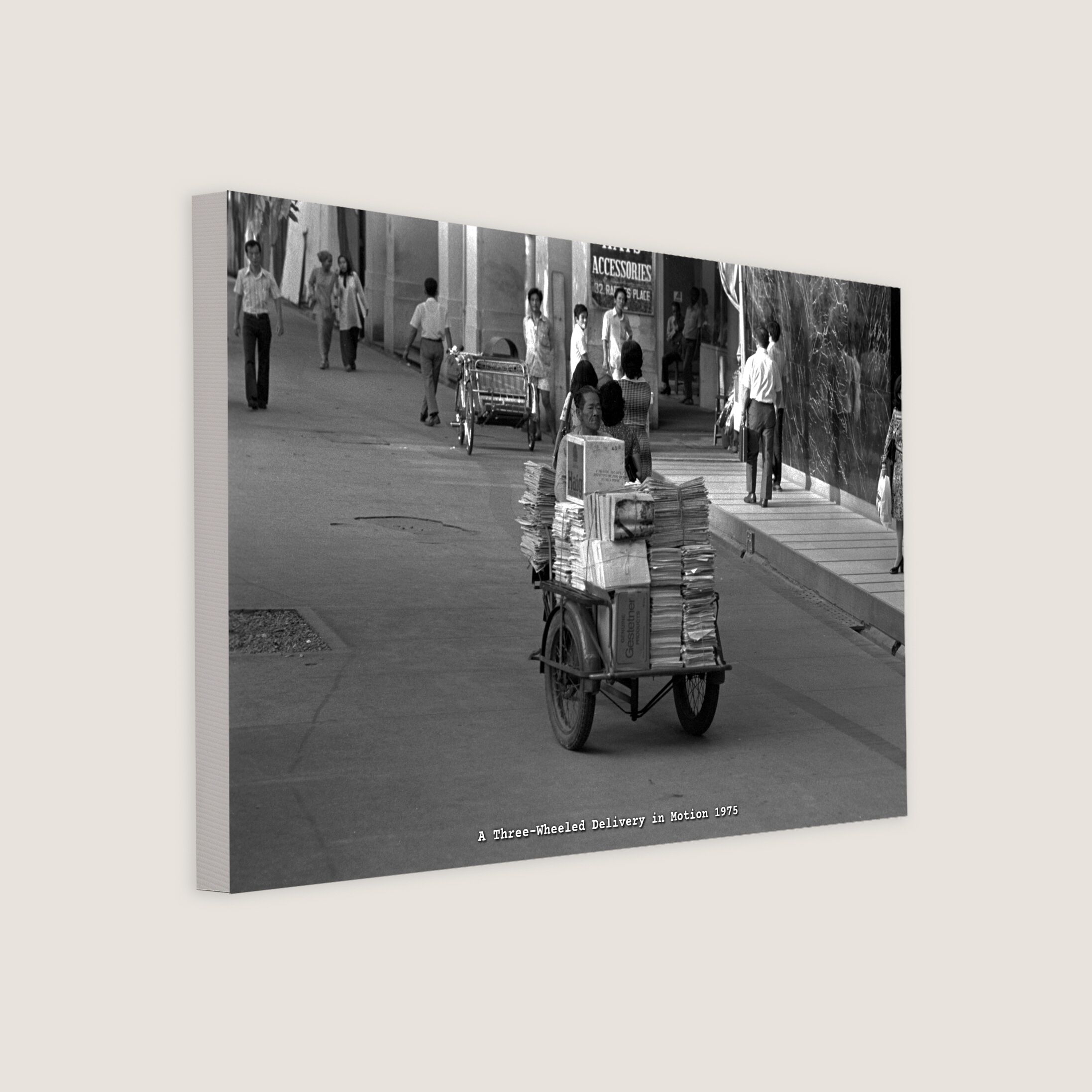 An elderly man riding a tricycle on the road, transporting books and papers. Trishaws played a crucial role in supporting informal sector businesses such as hawkers, street peddlers, and petty traders, by helping transport their goods.