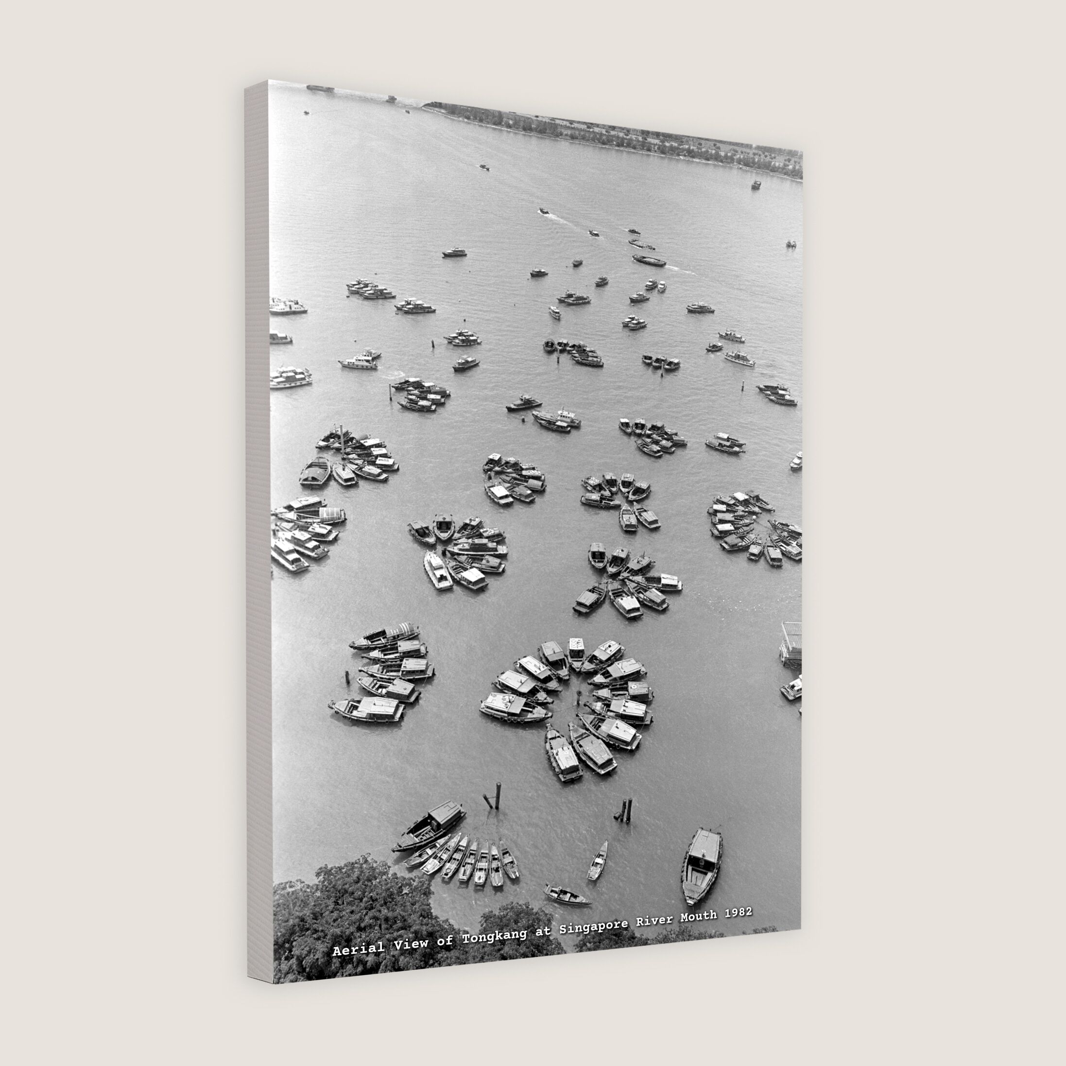 Clusters of tongkangs line the Singapore River. They are interlinked to prevent them from drifting with the current. Above in the photo, several tongkangs can be seen heading toward the open sea, preparing to unload cargo from the ocean-going vessels.