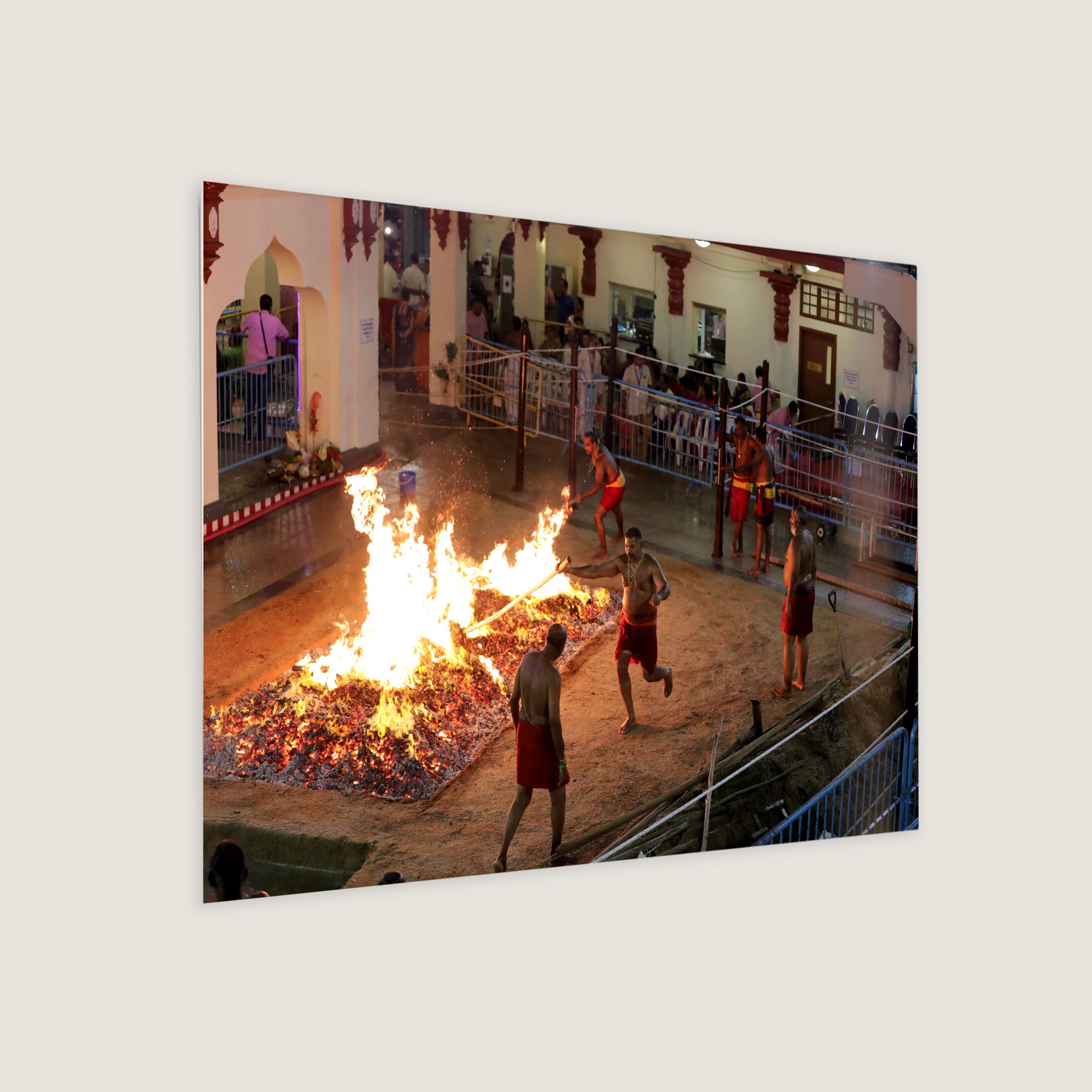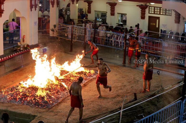 The annual firewalking ceremony at the Sri Mariamman temple on South Bridge Road. Held a week before Deepavali, the ritual is performed as a form of penance or thanksgiving to the Hindu deity Sri Drowpathai Amman.