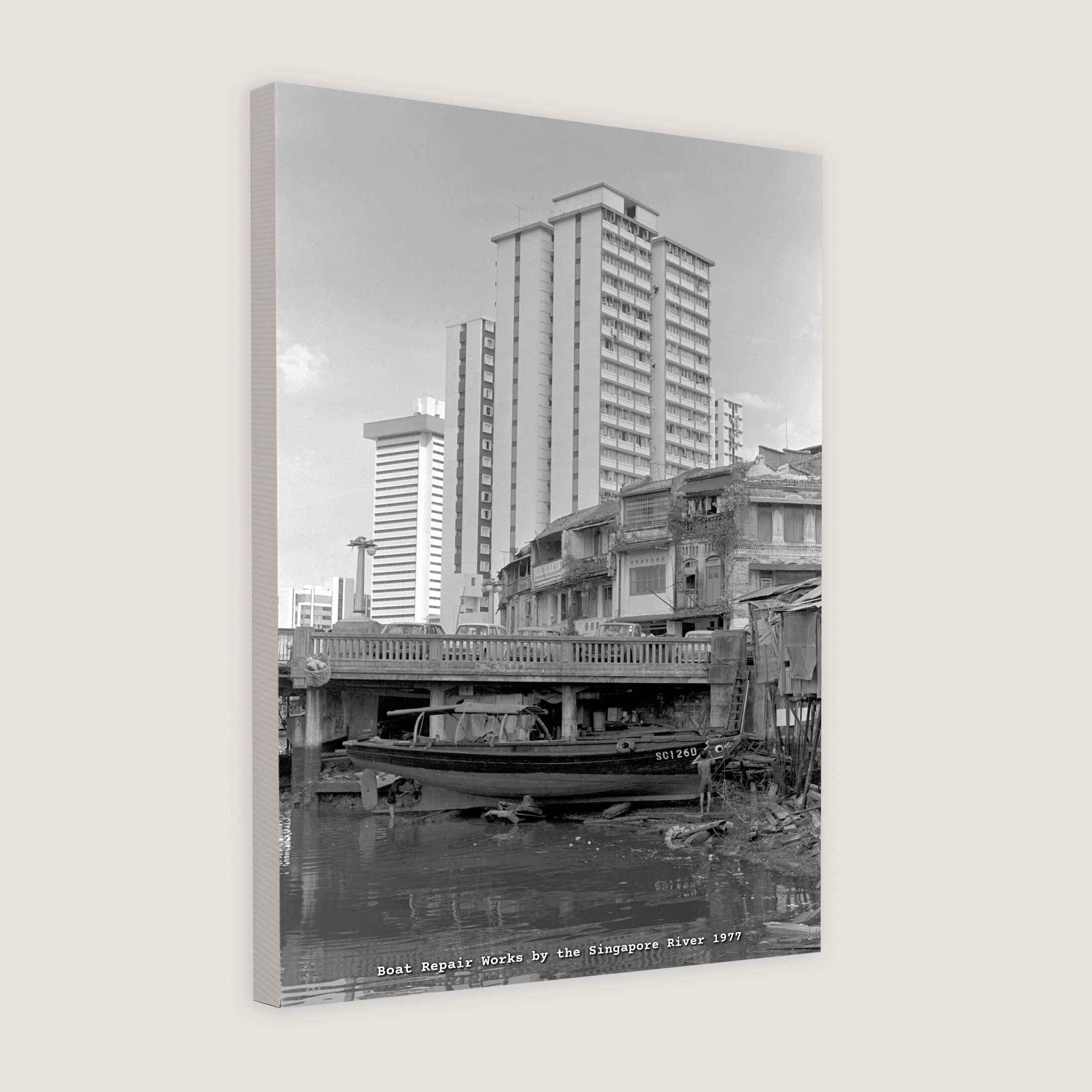 A boatman skillfully repairs boats by the Singapore River. After the river cleanup efforts between 1977 and 1987, these traditional boats were repurposed as river taxis, offering tourists and locals alike a unique perspective on the Singapore River's transformation and scenic beauty.