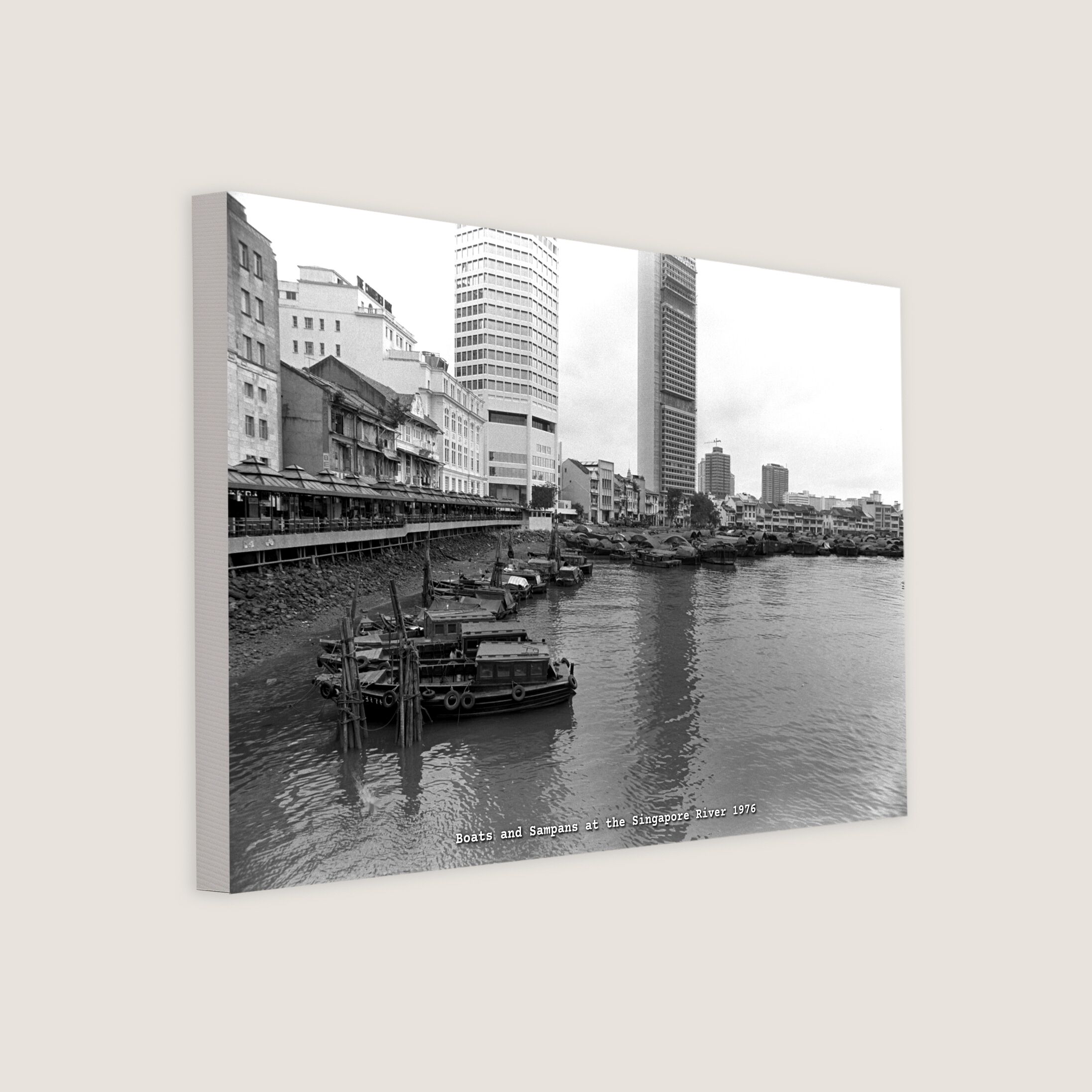 Boats and sampans showcasing the Singapore River's role as a bustling hub for commerce and trade. However, this economic activity came at a cost, as the river suffered from severe pollution. This photo was taken on the cusp of a major clean-up effort, which would take place from 1977 to 1987 and transform the river into the thriving waterway we know today.