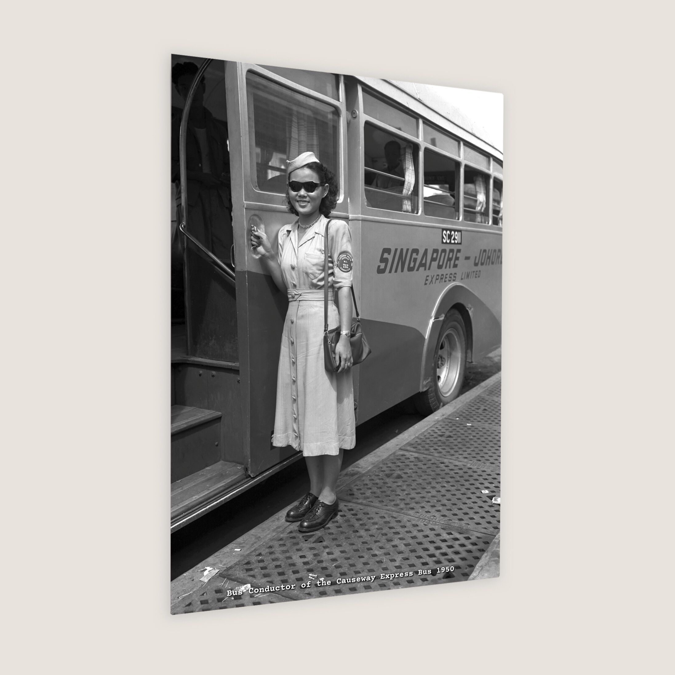 A pioneer women bus conductor working for the Johore-Singapore express bus service. The Causeway is a road and rail link between Singapore and Johor Bahru in Malaysia that was completed in 1923.