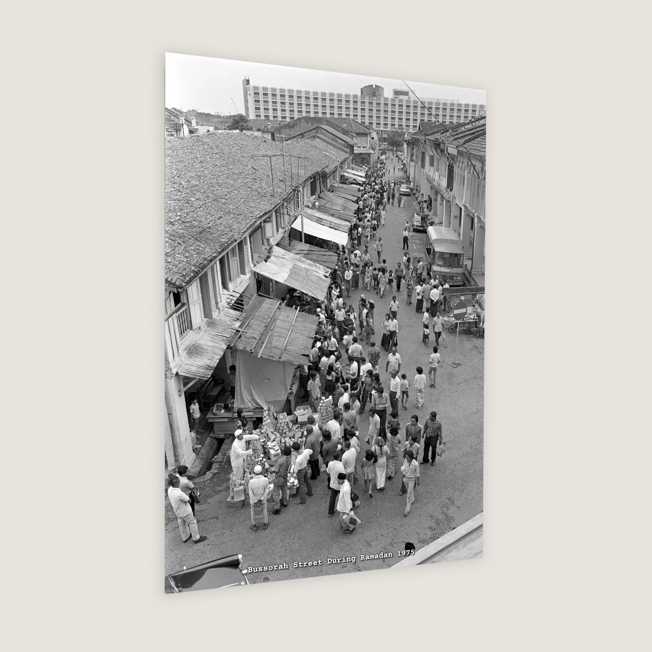 Food stalls along Bussorah Street were ready for business as Hari Raya Puasa approached. The photo shows that the Park Royal Hotel was under construction.