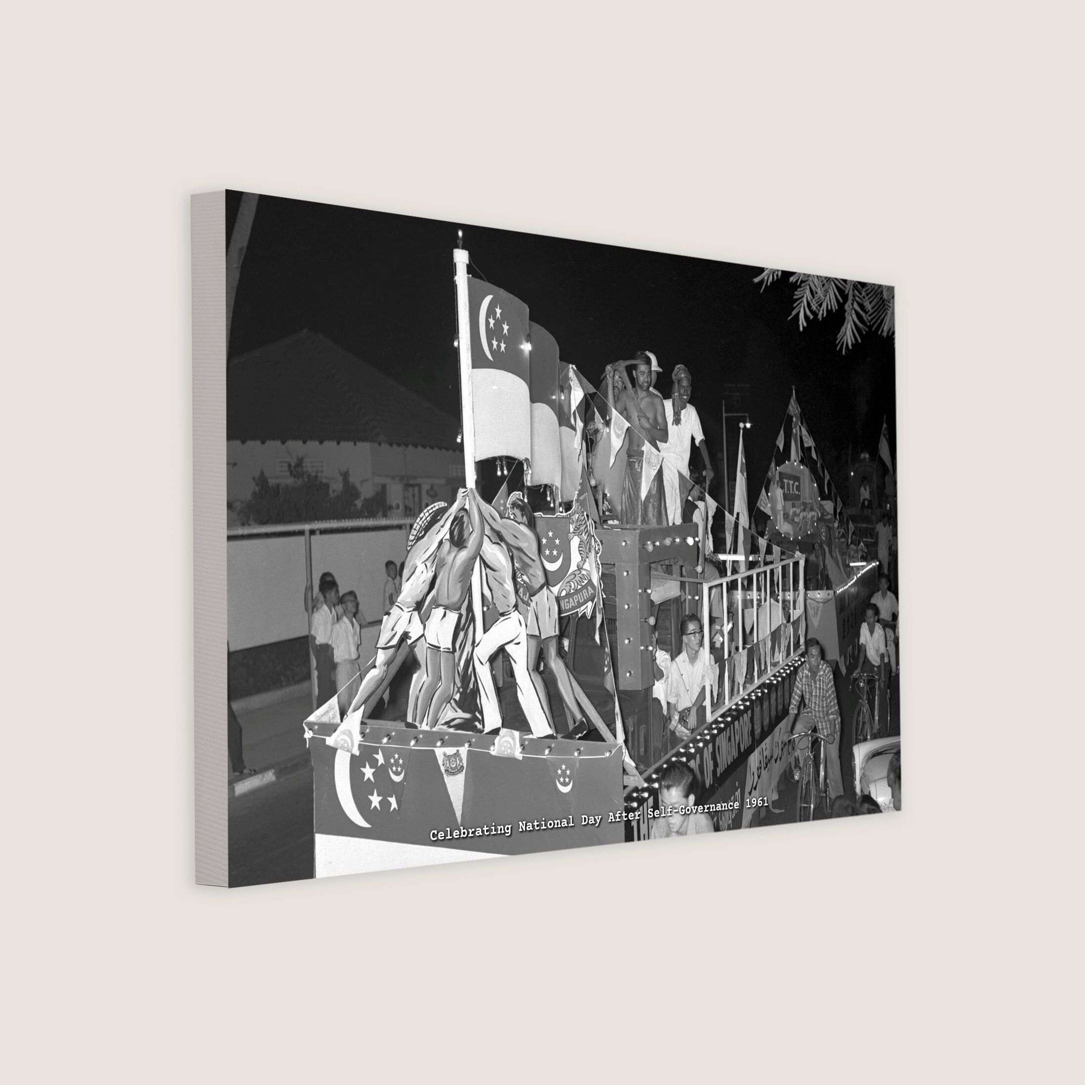 A float with the state flag was featured in the National Day procession. In 1959, a new state flag was created to represent Singapore shortly after it became a self-governing state under British rule. This flag was subsequently adopted as the national flag when Singapore became an independent nation on 9 August 1965.