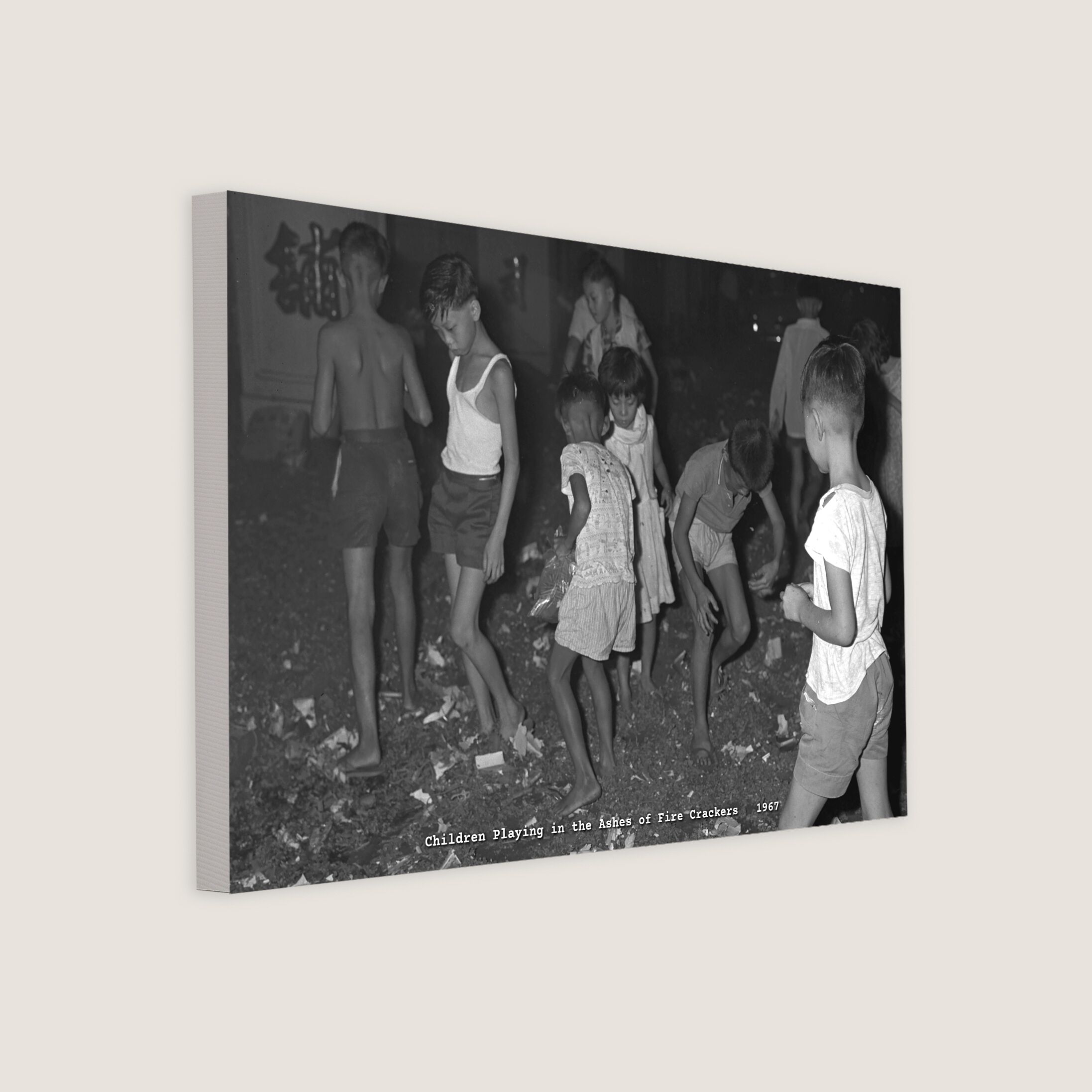 Children playing among the ashes of burnt firecrackers on the eve of Chinese New Year. Firecrackers are set off as a symbol of good fortune and prosperity, as it was believed that the loud noise would ward off evil spirits. Today, firecrackers are banned. Singapore imposed a partial ban on firecrackers in March 1970 after they caused a fire that killed 6 and injured 68 people. A total ban was enacted in 1972 after policemen were attacked for preventing unlawful usage of firecrackers.