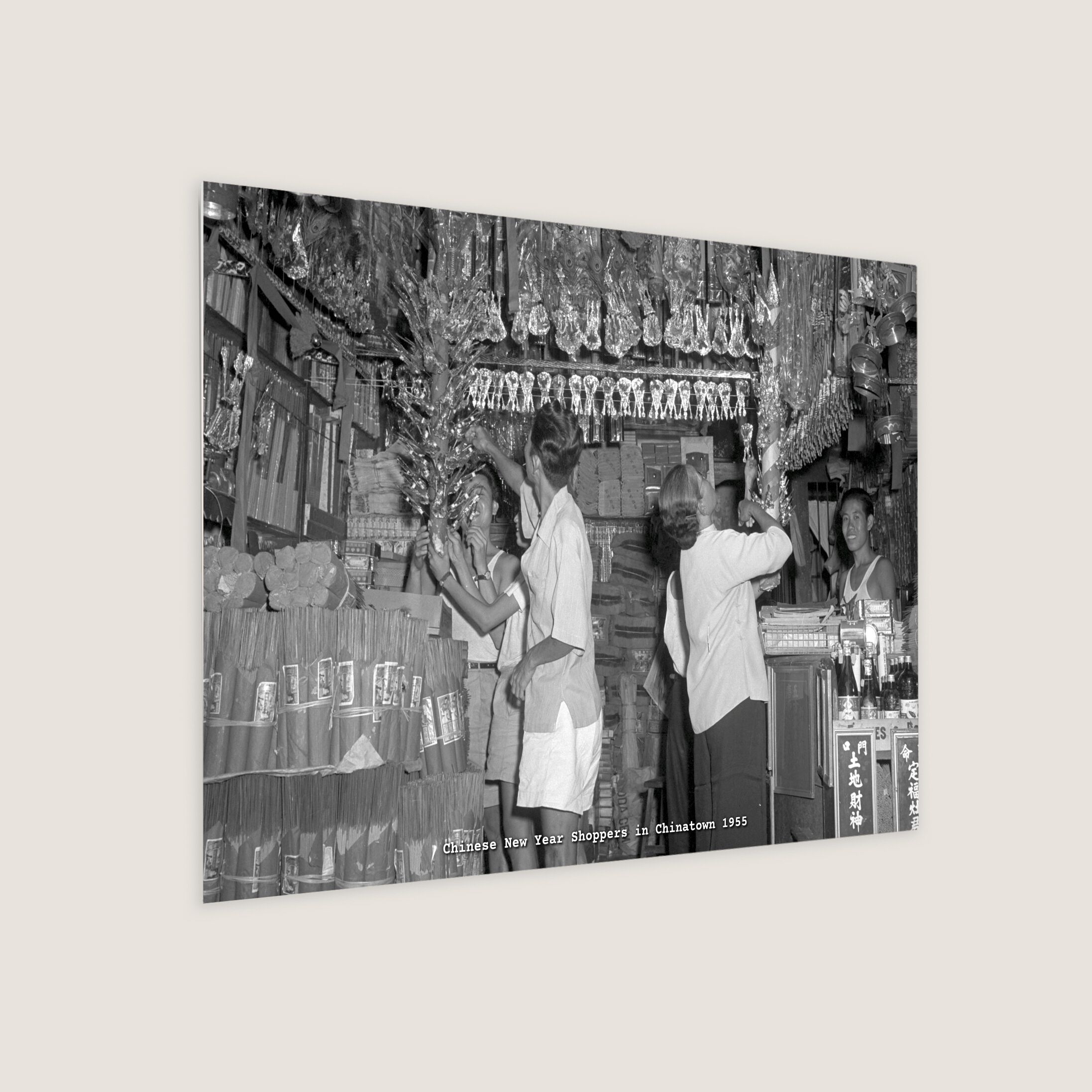 Here are some Chinese New Year shoppers in Chinatown in 1955. This shop primarily sells wares for prayers, such as joss sticks and joss papers. These offerings are meant to appease the deceased.