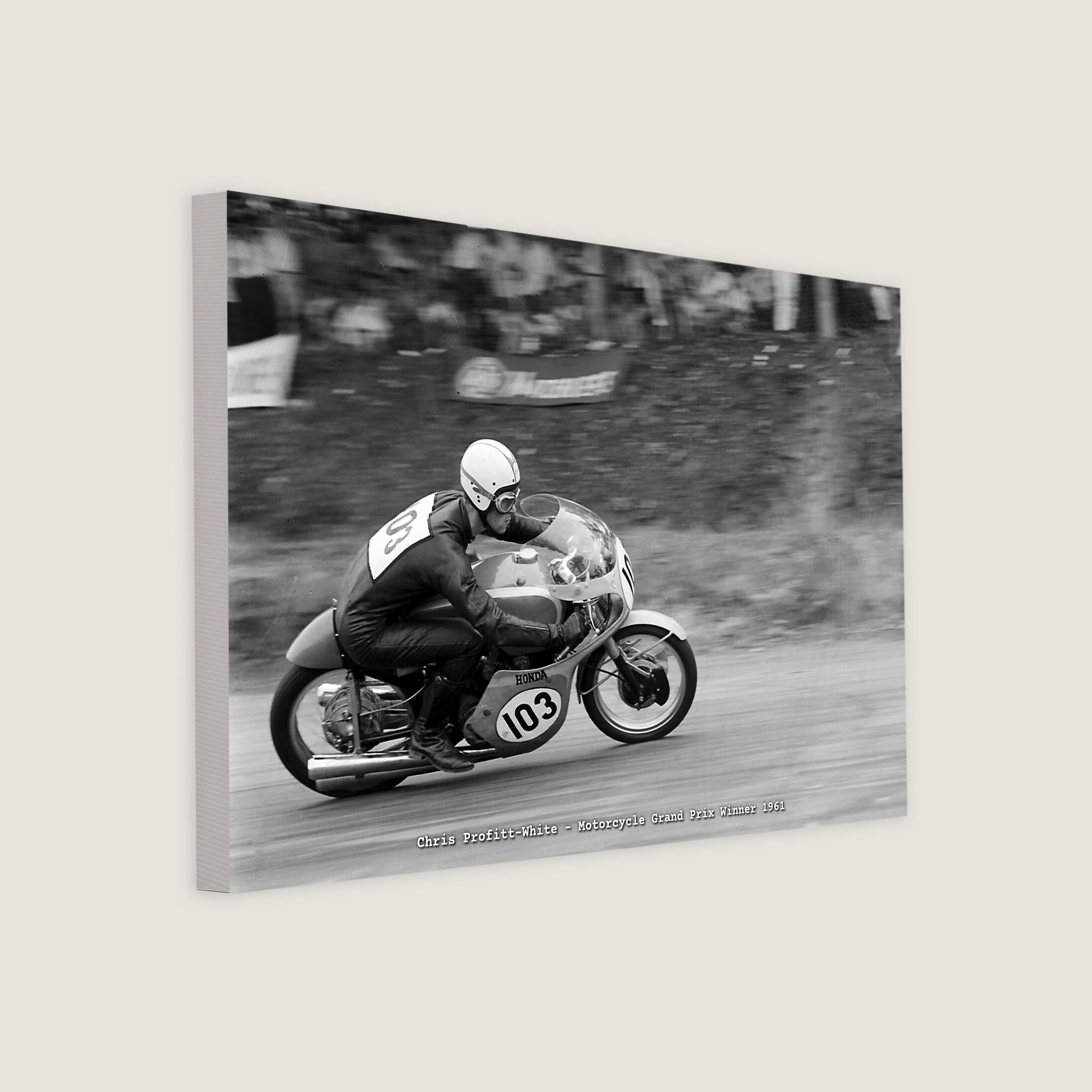 Chris Profitt-White (103), a British technician with the Royal Air Force, was the winner of the 1961 Grand Prix for Motorcycles on his Honda 4 250cc bike. He completed 60 laps (180 miles) in 2 hours, 59 minutes, and 43.5 seconds.
