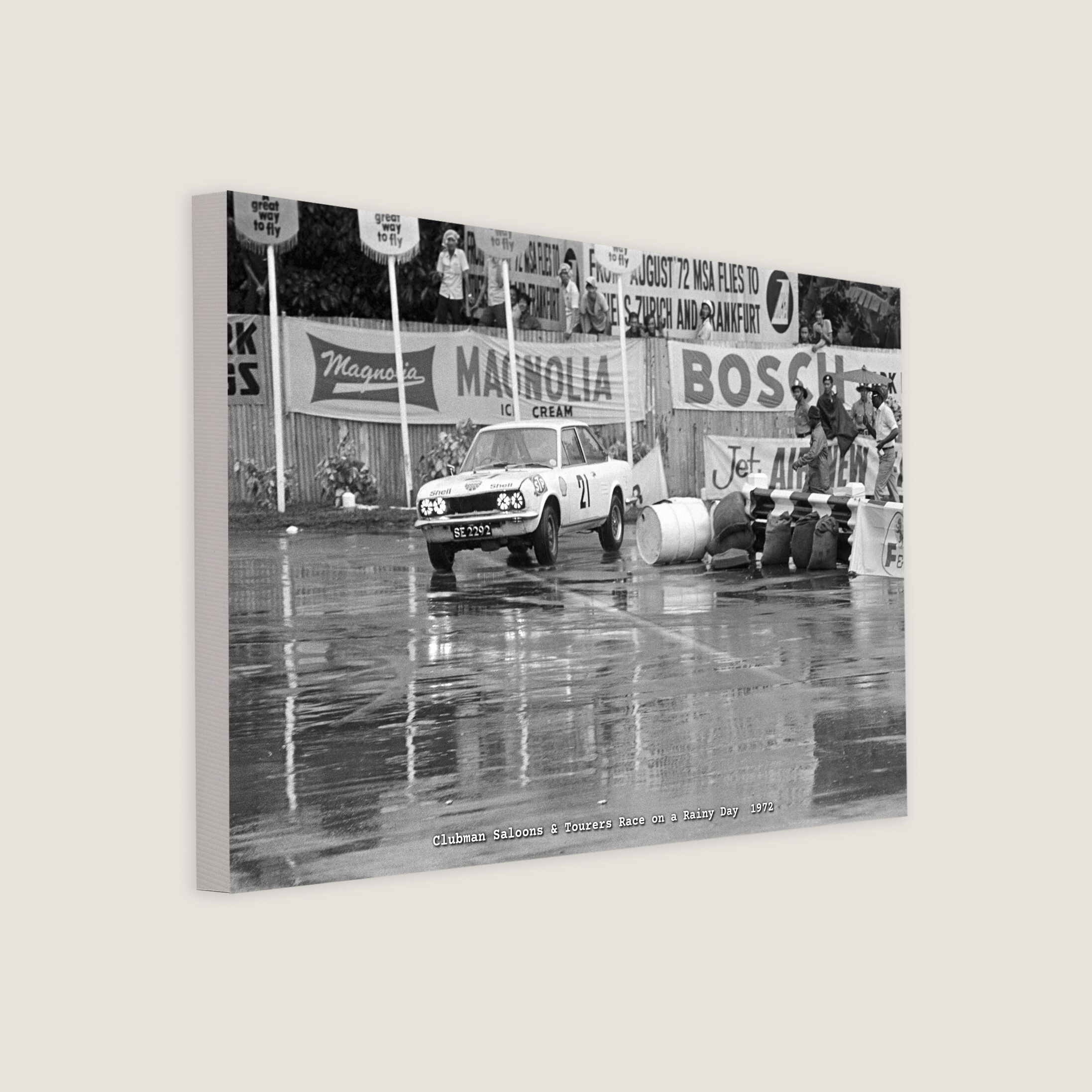 R.A Fisher's (21) Fiat precariously rounds the bend on a wet race day during the Clubman Saloons & Tourers Race of the 1972 Singapore Grand Prix. The Clubman races were introduced to allow more entrants from Singapore and Malaysia to take part in the races, as the main events were dominated by international competitors.
