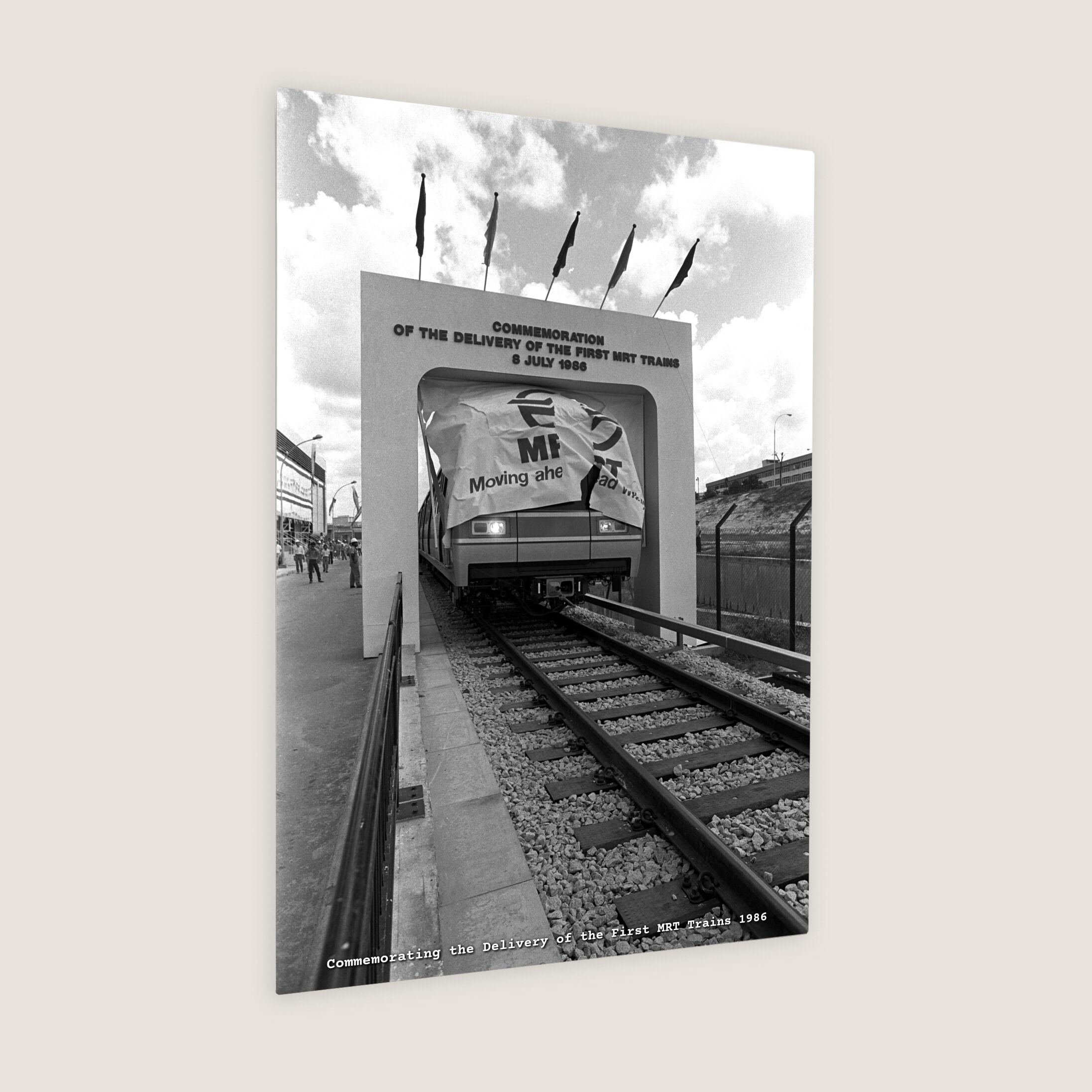 The first MRT train breaks through the rice-paper shield at a "tunnel" frame at the Bishan MRT Depot to commemorate the delivery of the first MRT trains. Guests were aboard Singapore's Mass Rapid Transit test ride that travelled for only three kilometres, taking three minutes and 43 seconds to conclude.
