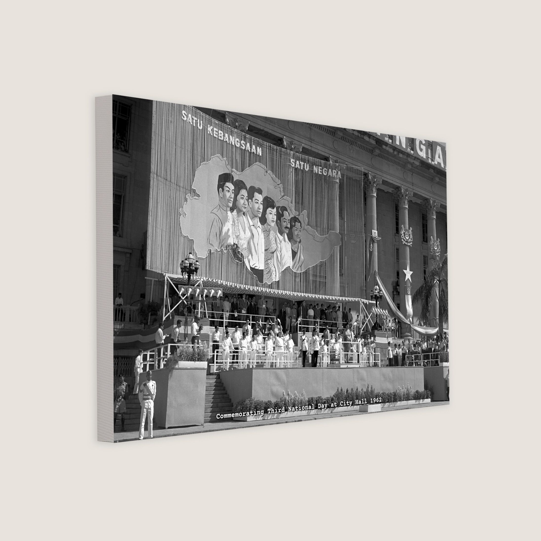 This photo captured a historical moment of Singapore. On 3 June 1962, Singapore commemorates its third National day at City Hall. A central banner showcasing a map of Singapore with illustrations of people from various ethnic backgrounds, symbolizing unity and diversity. Above the map, the Malay phrases "SATU KEBANGSAAN" and "SATU NEGARA" are prominently featured, translating to "One Nationality" and "One Country."