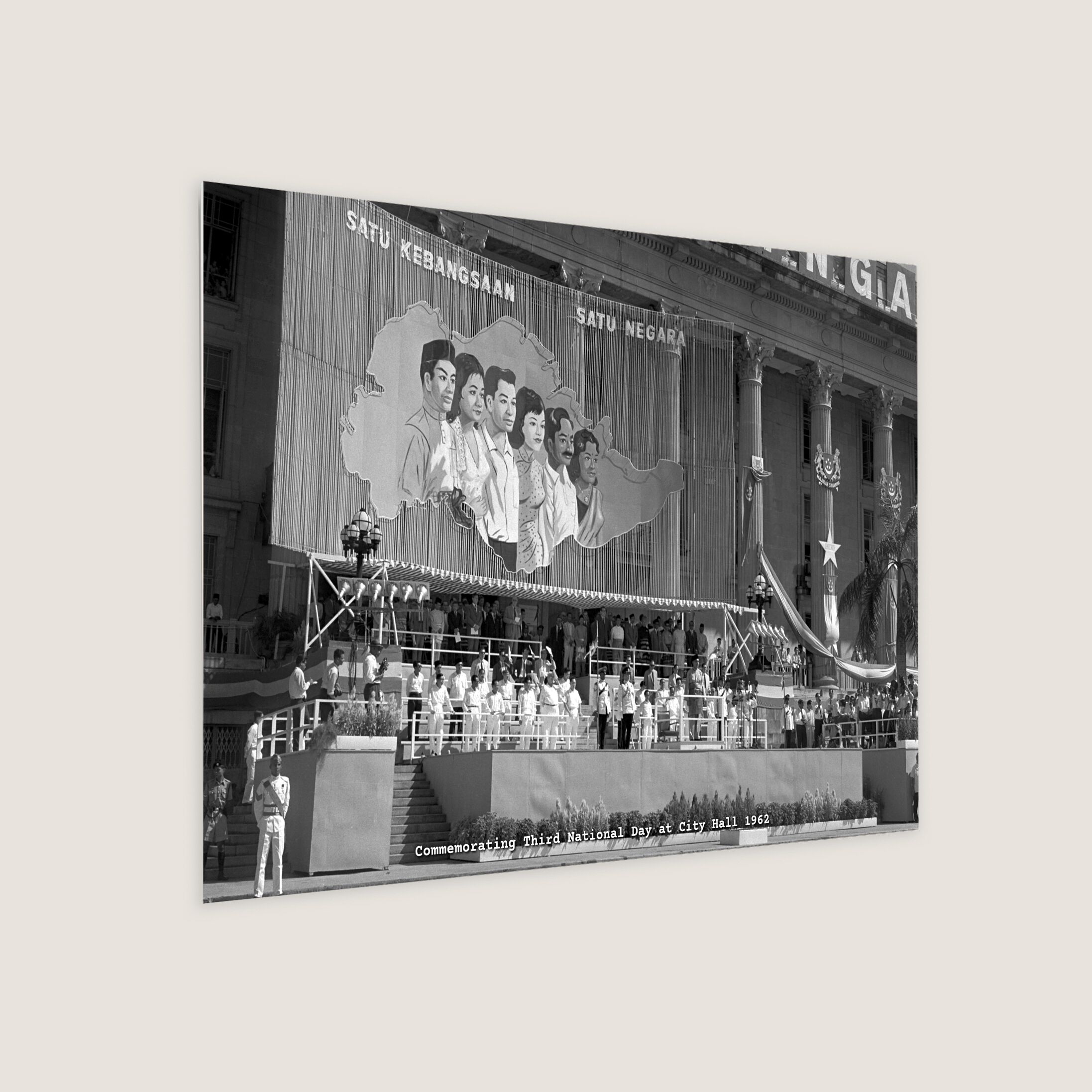 This photo captured a historical moment of Singapore. On 3 June 1962, Singapore commemorates its third National day at City Hall. A central banner showcasing a map of Singapore with illustrations of people from various ethnic backgrounds, symbolizing unity and diversity. Above the map, the Malay phrases "SATU KEBANGSAAN" and "SATU NEGARA" are prominently featured, translating to "One Nationality" and "One Country."