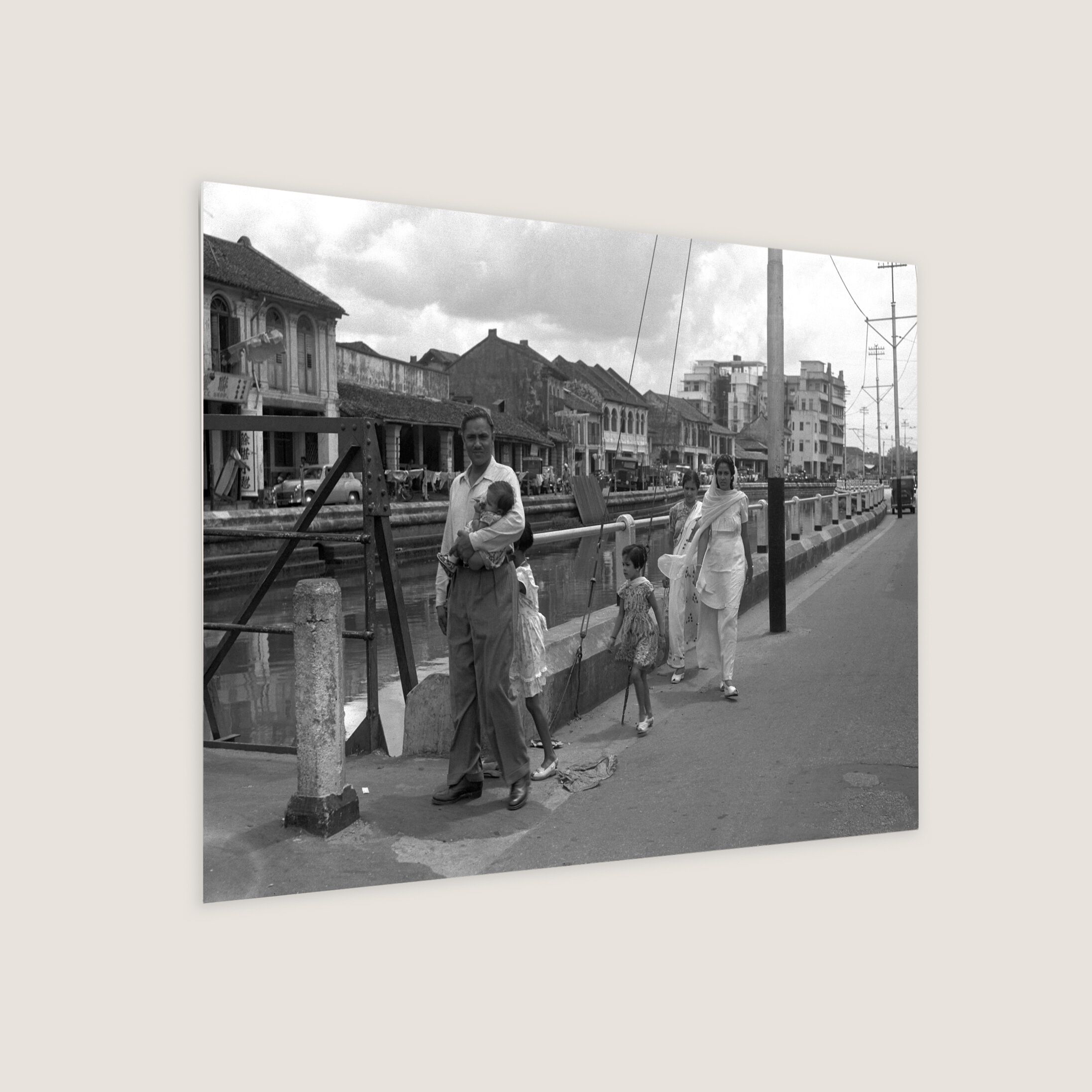 An Indian family makes their way across the footbridge spanning Rochor Canal during a Deepavali outing. In the background stands the White House Hotel (far right). Today, the Rochor Canal area has transformed into a residential district.