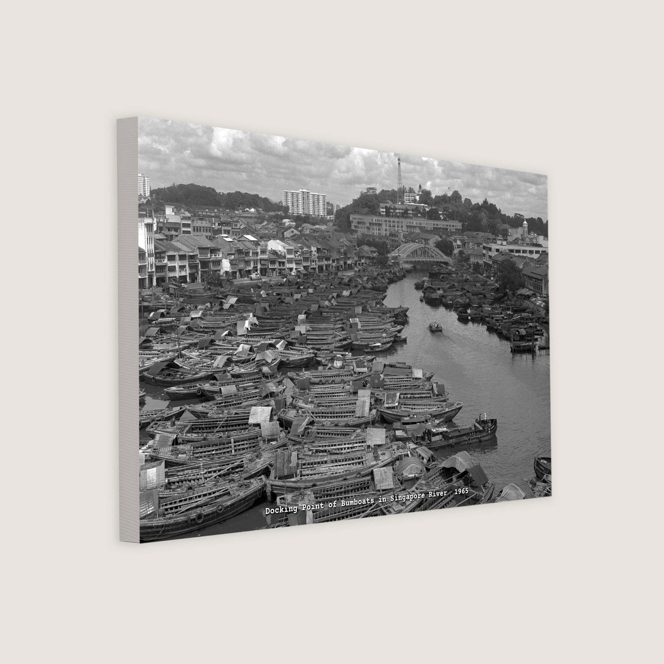 Bumboats are called tongkang in Malay and Twakow in the Fujian and Teochew languages in Singapore. They were used on the Singapore River, Kallang River, and Rochor River for loading and unloading goods, or for transporting cargo, supplies, and goods between ships and the shore. The docking point in this picture is along the Singapore River.