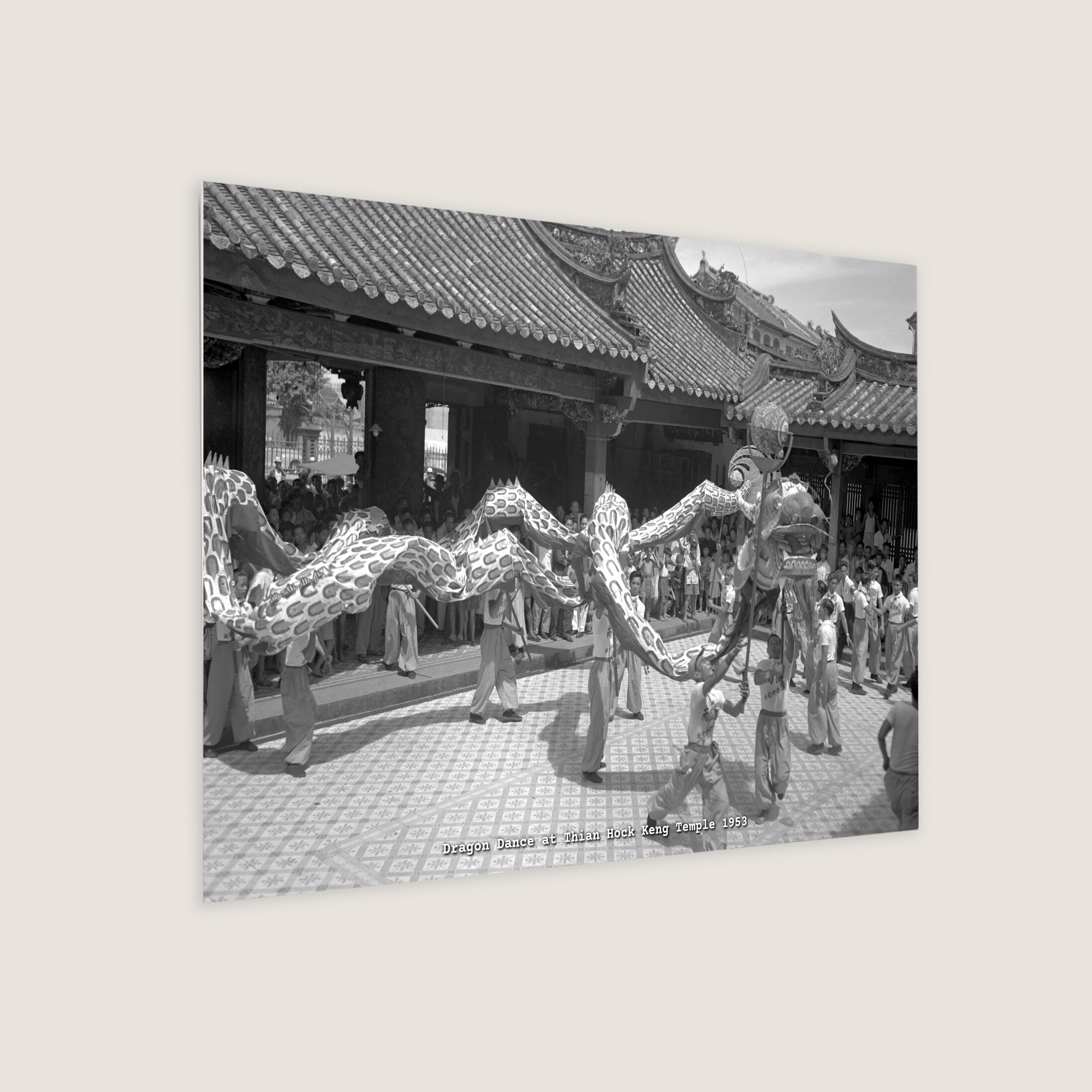 Dragon dance at Thian Hock Keng Temple at Telok Ayer on May 24, 1953. A Coronation dragon was offered to the gods in the temple as a symbol of the World's hope for peace during the reign of the Queen. The dragon, 100 feet long, is a contribution from the Mun Nam Pugilistic Study Association to the Chinese procession on Coronation night.