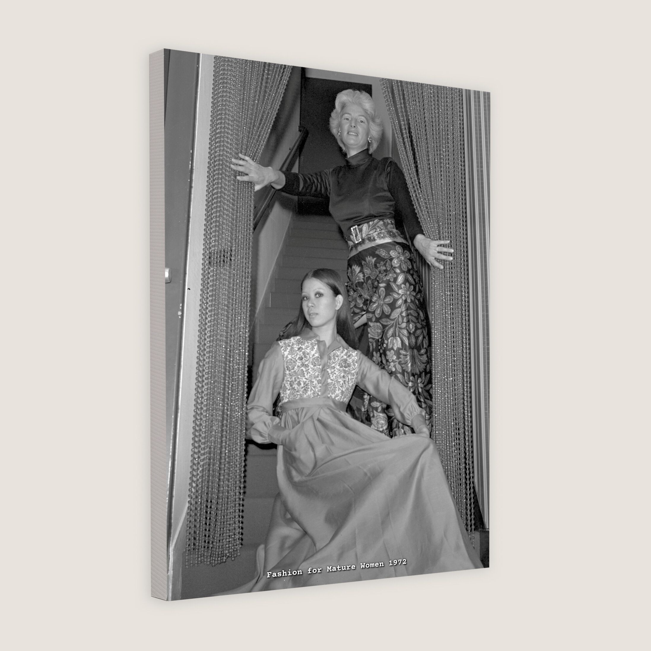 Featuring fashion for mature women, Mrs Sheila Snowden stands up in a long jersey dress that can be worn for a casual evening function. Meanwhile, Nancy models an ankle-length gown with an empire line.