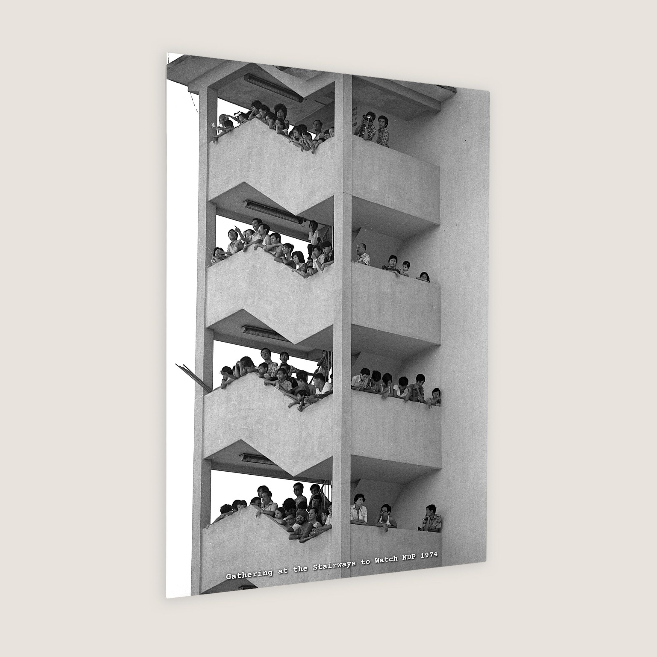 Spectators gathered at the stairways of a flat to watch the National Day Parade at Paya Lebar on 9 August 1974.