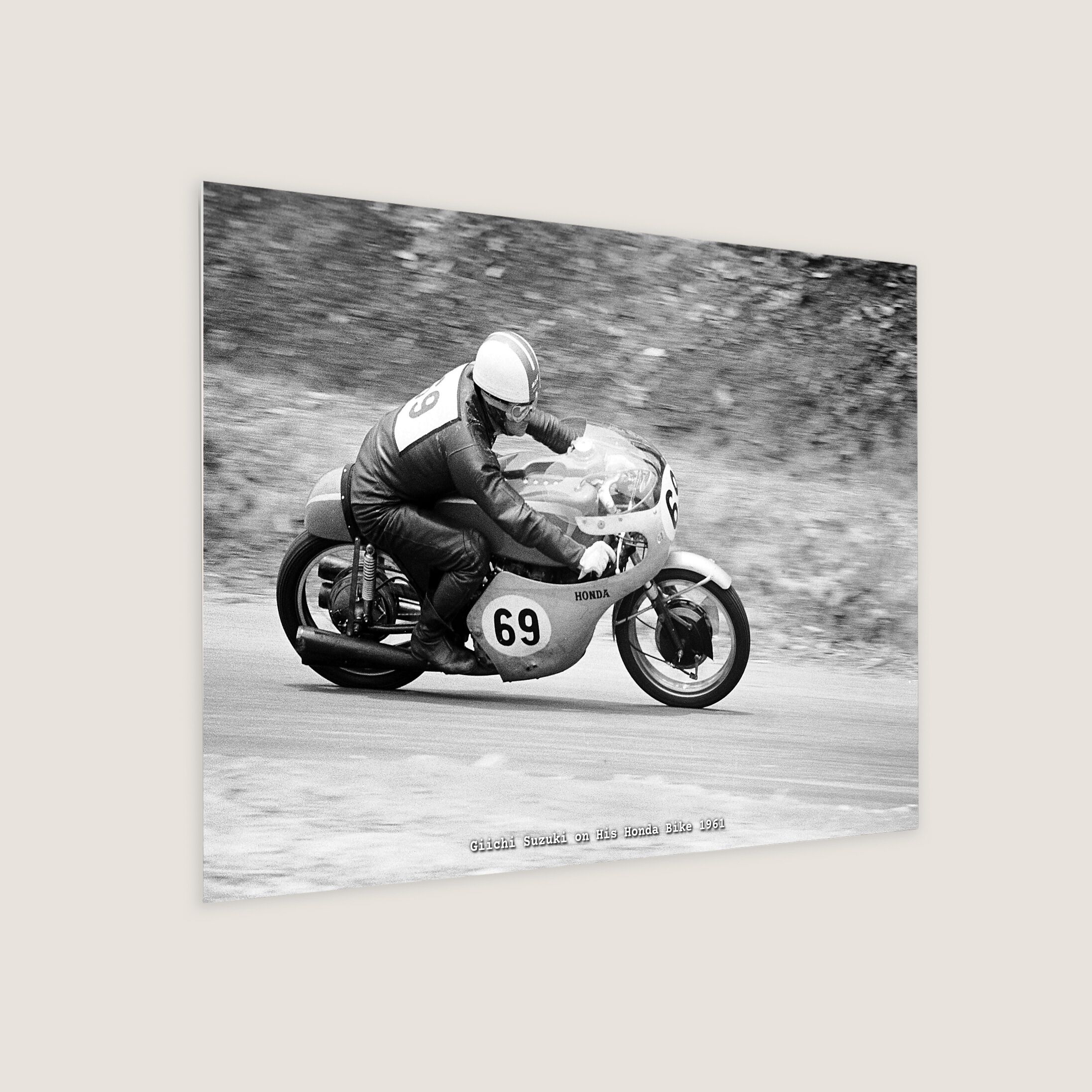 Giichi Suzuki (69) was a Honda Team rider who came in second in the 1961 Motorcycle Grand Prix on his factory Honda 4 250cc bike. He completed 60 laps (180 miles) in 2 hours, 59 minutes, and 43.5 seconds.