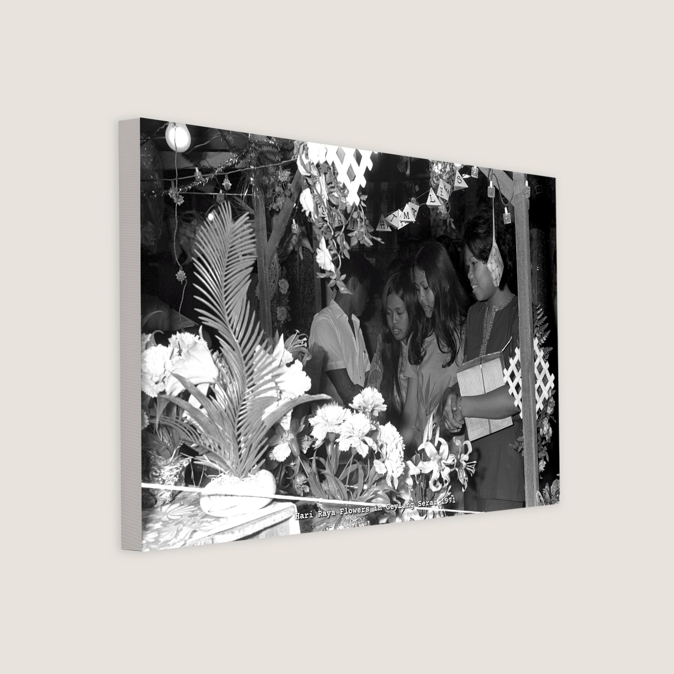 Three girls buying flowers for Hari Raya Puasa in Geylang Serai. "Serai" means “lemongrass” in Malay. Some suggest that the name Geylang is a corruption of the Malay kilang, which means “press”, “mill” or “factory”.