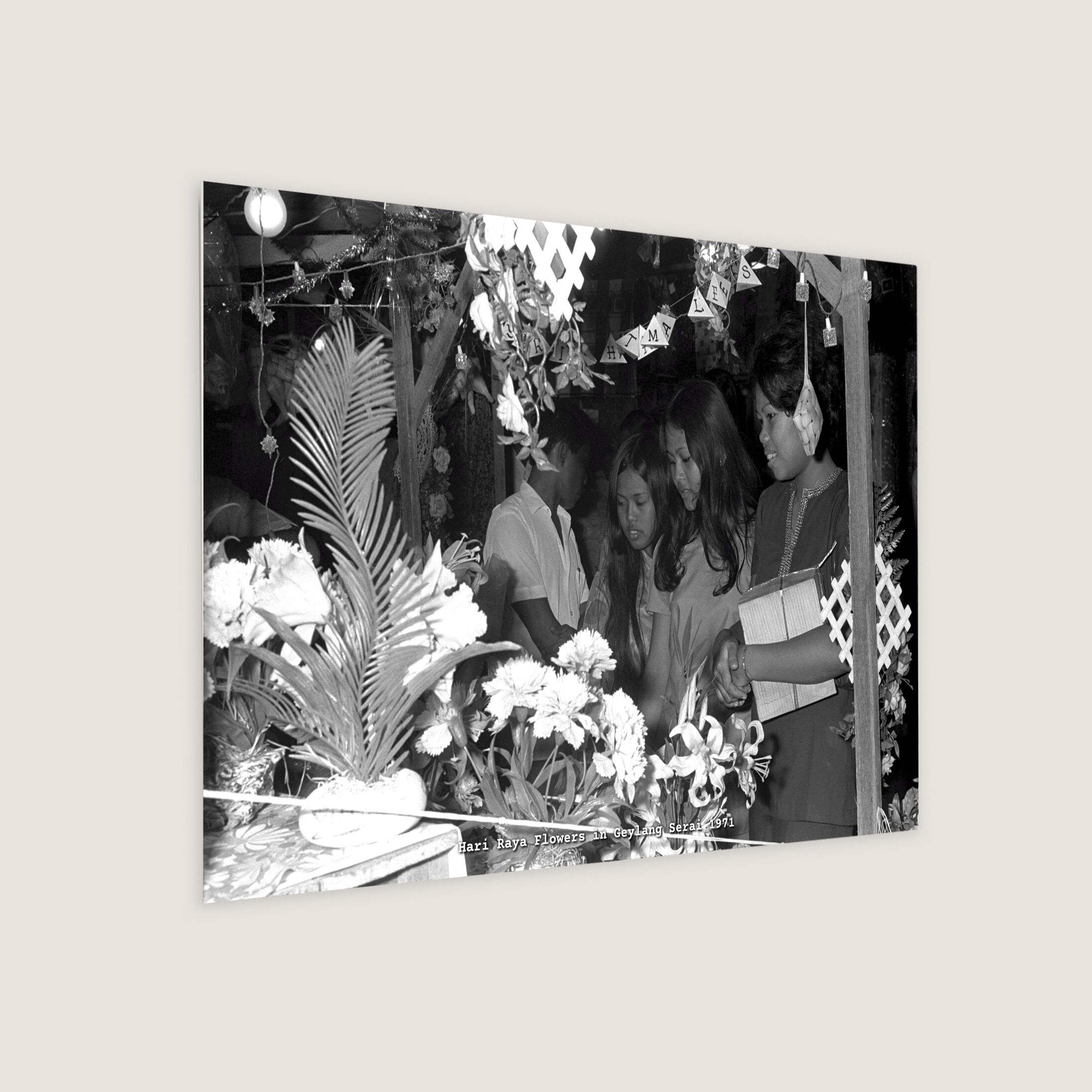Three girls buying flowers for Hari Raya Puasa in Geylang Serai. "Serai" means “lemongrass” in Malay. Some suggest that the name Geylang is a corruption of the Malay kilang, which means “press”, “mill” or “factory”.