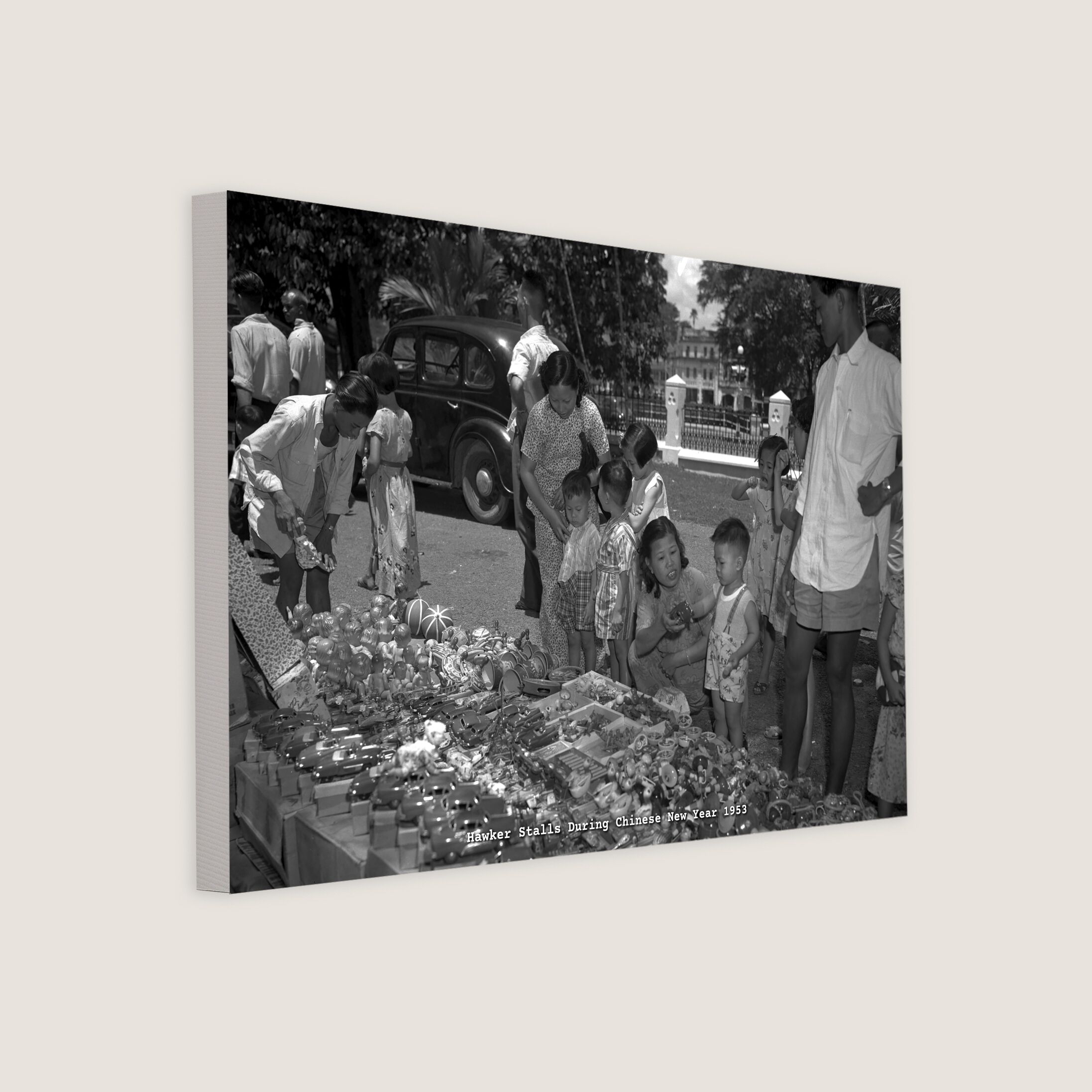 The Chinese have a tradition of starting the new year with new clothes or accessories, symbolizing a fresh start and good luck. Young children are intrigued by hawker toy stalls located on the lawn outside the entrance to the Raffles Museum. This photo was taken during Chinese New Year, 16 February 1953.