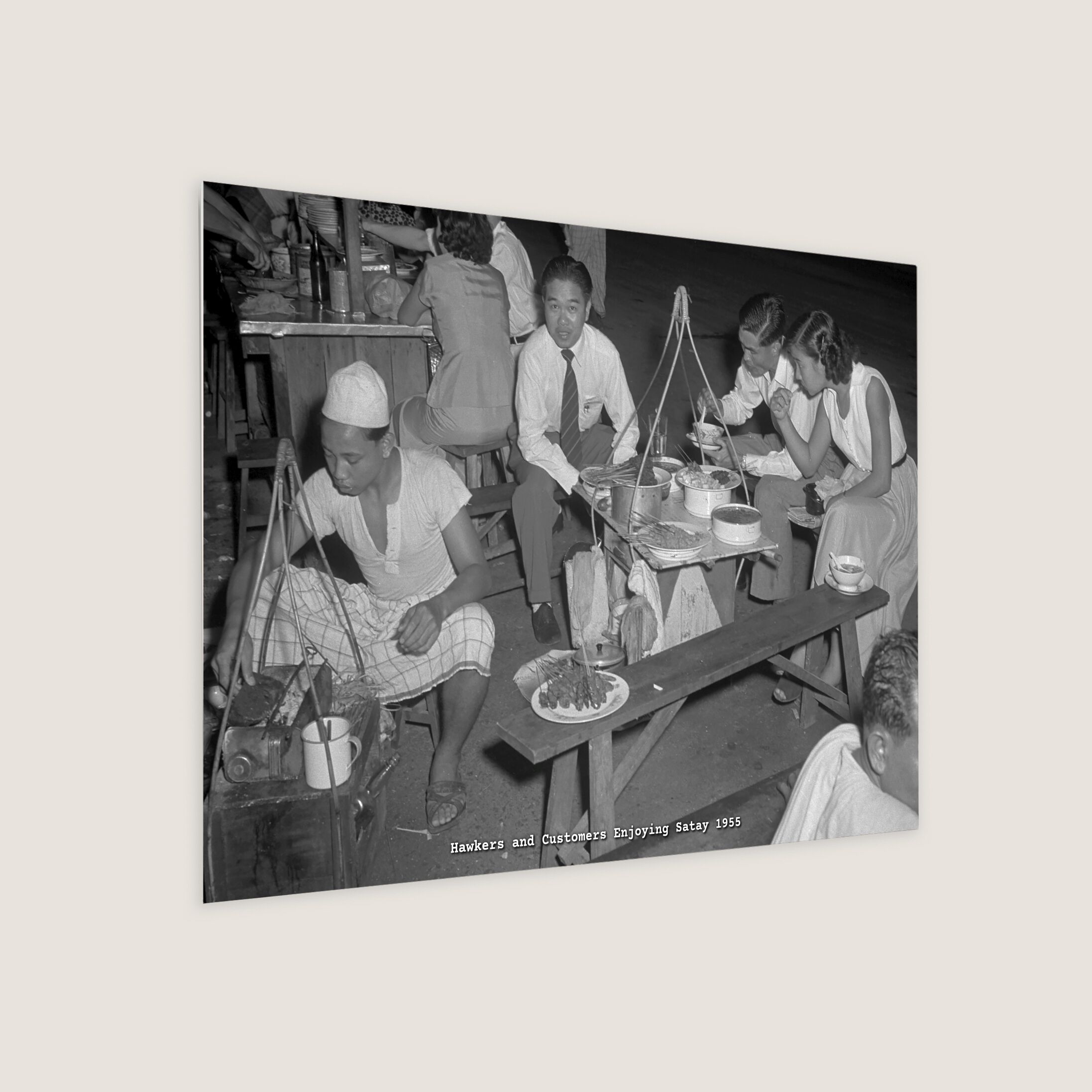 A street hawker was fully focused on grilling satay, skewered pieces of meat, typically beef or mutton, at his portable stall. Strangers would find a seat, happily help themselves to the satay, dip it into a communal pot of gravy, and pay only for the number of sticks they took.
