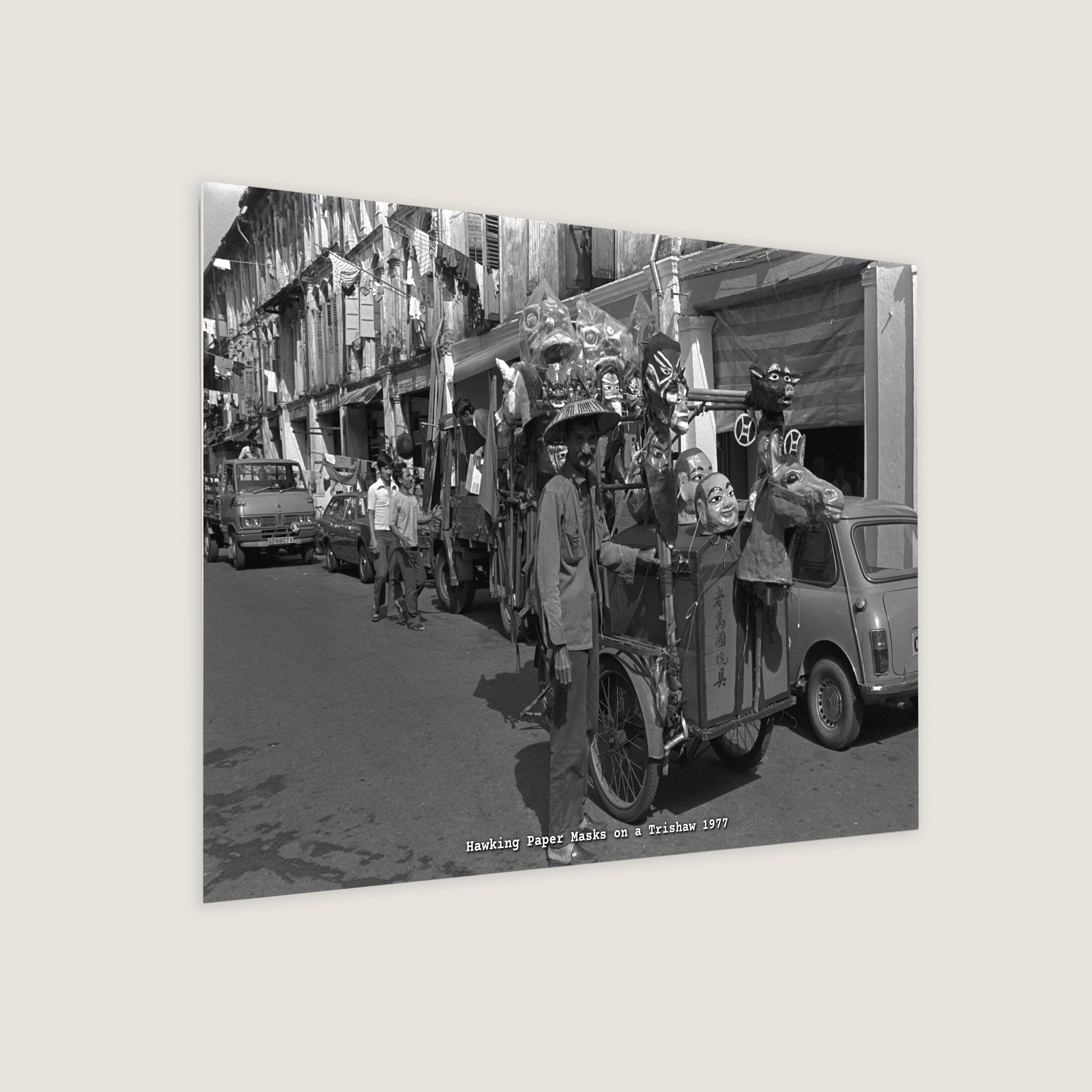 A hawker who earns his living by selling paper masks operates from his trishaw. For this elderly man, the trishaw is his means of livelihood. The craft of making paper headpieces and masks has faded over time, and with the rise of modern transportation, trishaws have become increasingly rare. In 2023, they stopped operations completely.
