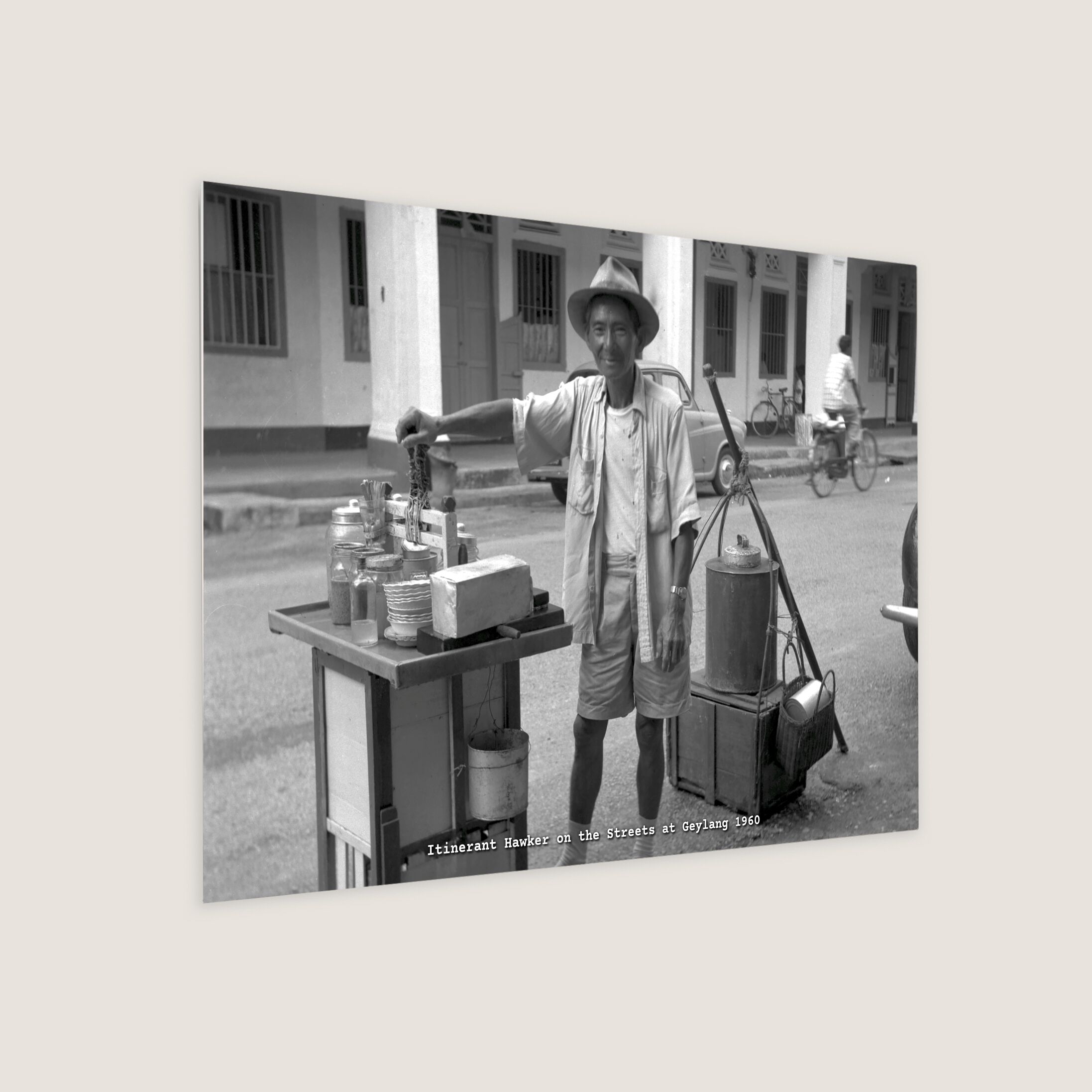 A street hawker peddling food in Geylang, situated in front of a public school. Itinerant hawkers were a familiar sight in Singapore from the 19th century through to the mid-20th century. They could often be seen along bustling streets and busy intersections, selling a wide array of items such as food, drinks, vegetables, poultry, and various other goods. In this photograph, the hawker is seen offering food to passersby.