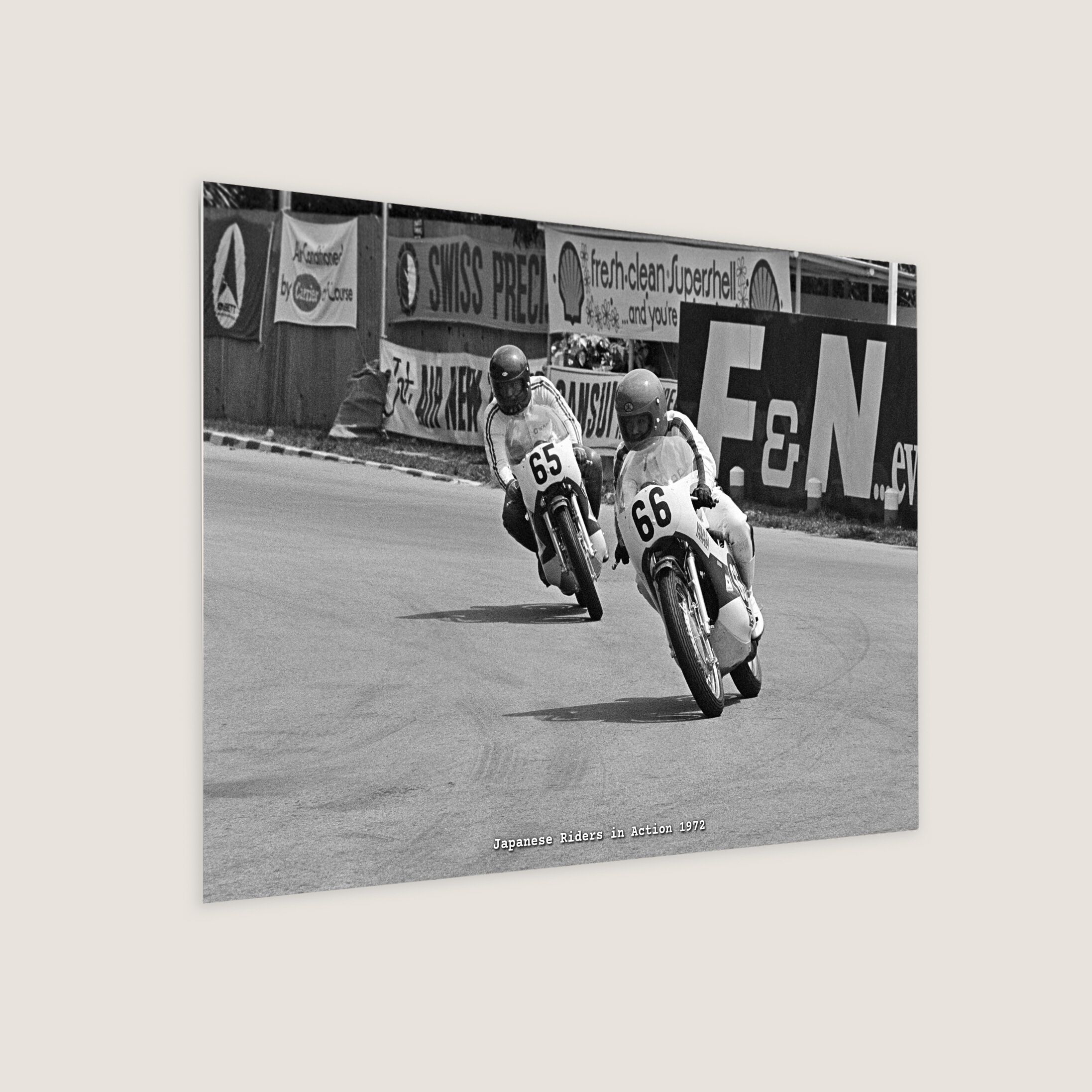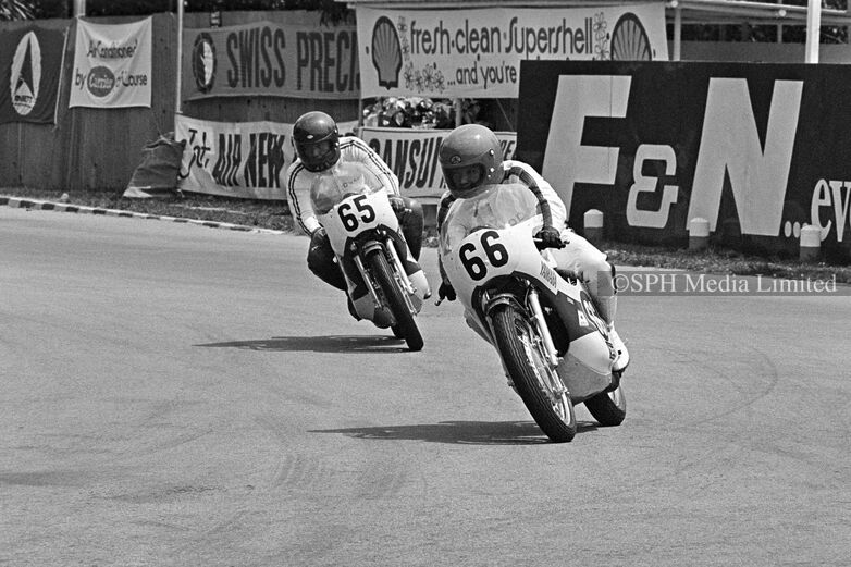 Yamaha motorcycle riders Toshio Owaki (65) and Y. Oda (66) turning into the Circus Hairpin at Sembawang Hills Circus during the 1972 Singapore Grand Prix on the Upper Thomson Road Circuit.